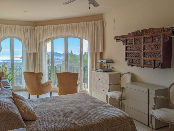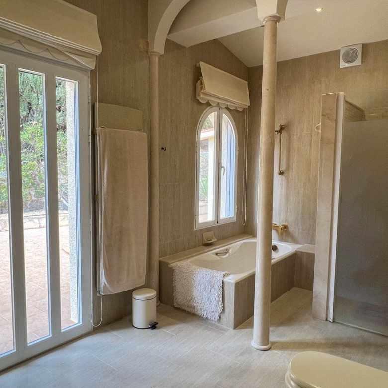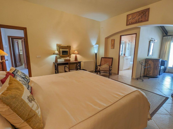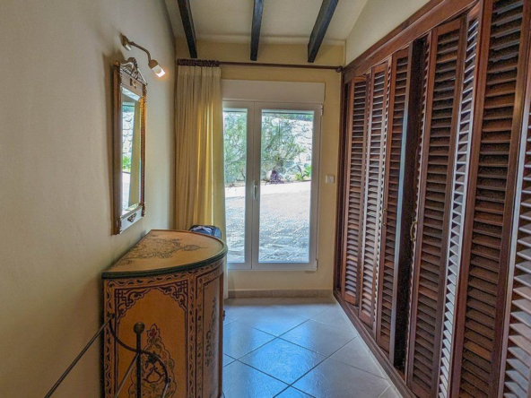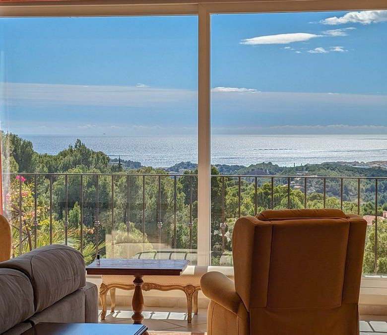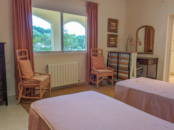 La propriété vous accueille dans le hall d’entrée, menant à une salle à manger lumineuse et accueillante et à un salon confortable et spacieux avec un poêle à bois, tous deux offrant de belles vues paisibles sur la verdure qui mènent à une vue mer captivante. Il y a une belle cuisine bien équipée avec une grande buanderie séparée et des toilettes invités. Cette propriété idéale dispose de 3 chambres (la plus petite étant actuellement utilisée comme bureau), chacune avec sa propre salle de bains attenante. Les terrasses, couvertes et en plein air, offrent des vues panoramiques sur la mer Méditerranée captivante, les magnifiques jardins de la villa et sa charmante zone de piscine.