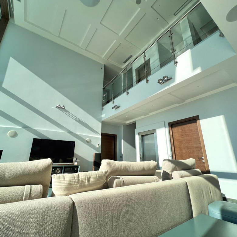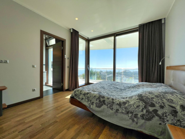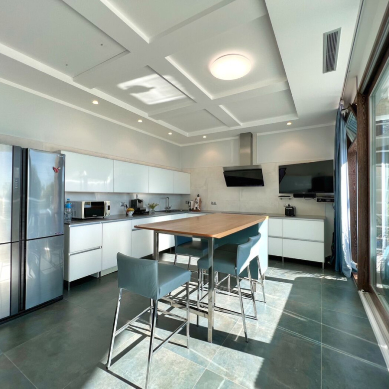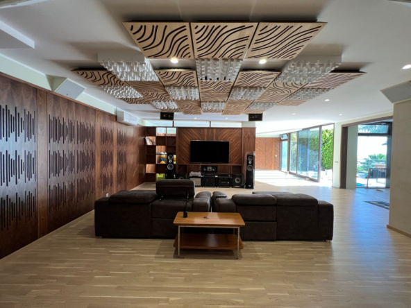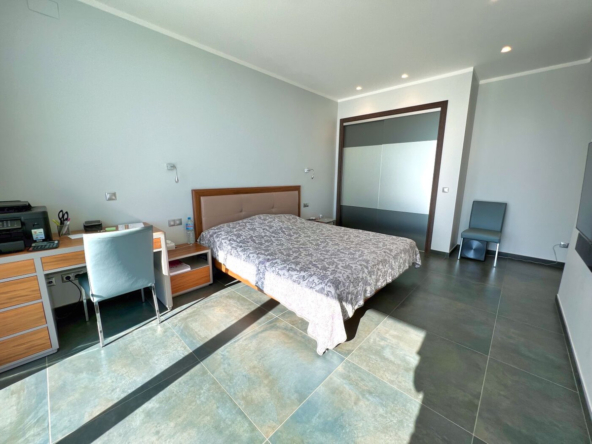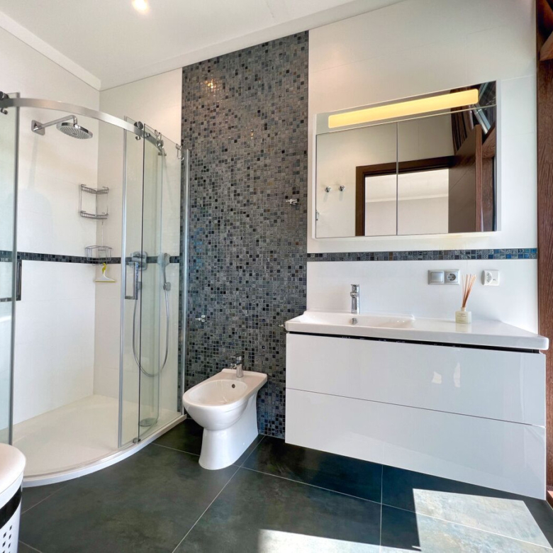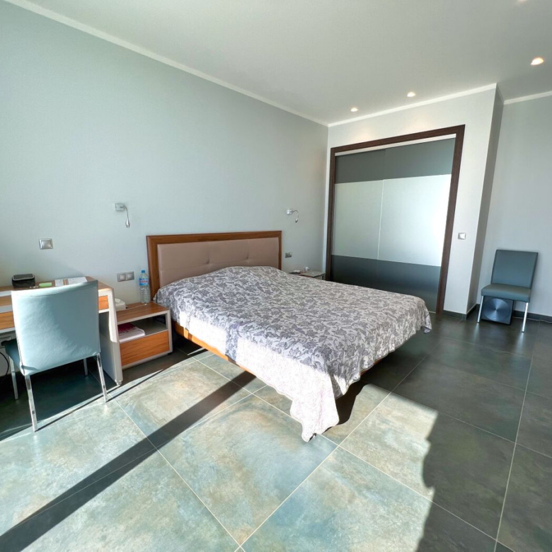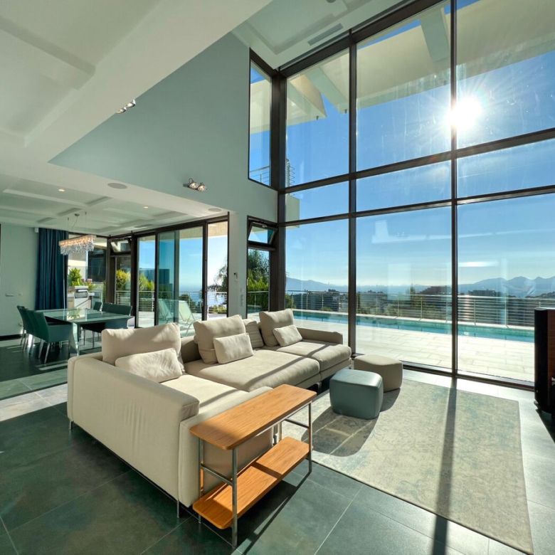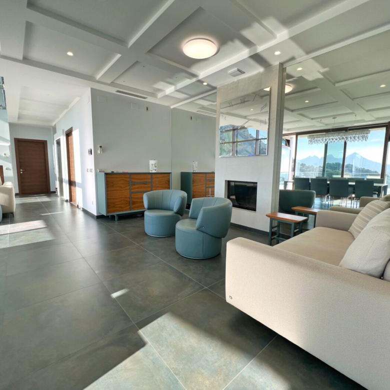 La villa est équipée de meubles design (Rolf Benz), de rideaux électriques, d’armoires encastrées, d’un chauffage par le sol (AEROTERMIA), de portails automatiques, de la climatisation, d’un système d’alarme, etc. La façade de la villa et même la clôture, les murs de soutènement et les murs de l’escalier sont revêtus de pierre naturelle de couleur beige clair CALISA.
