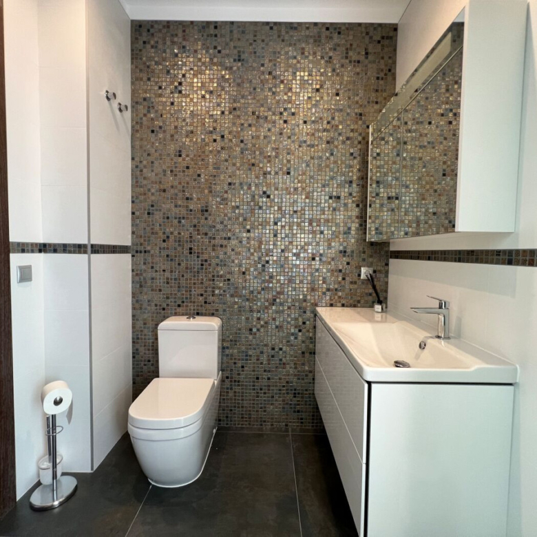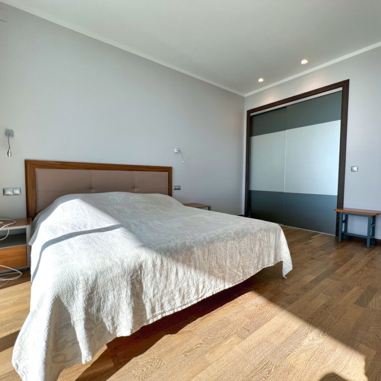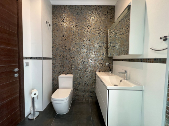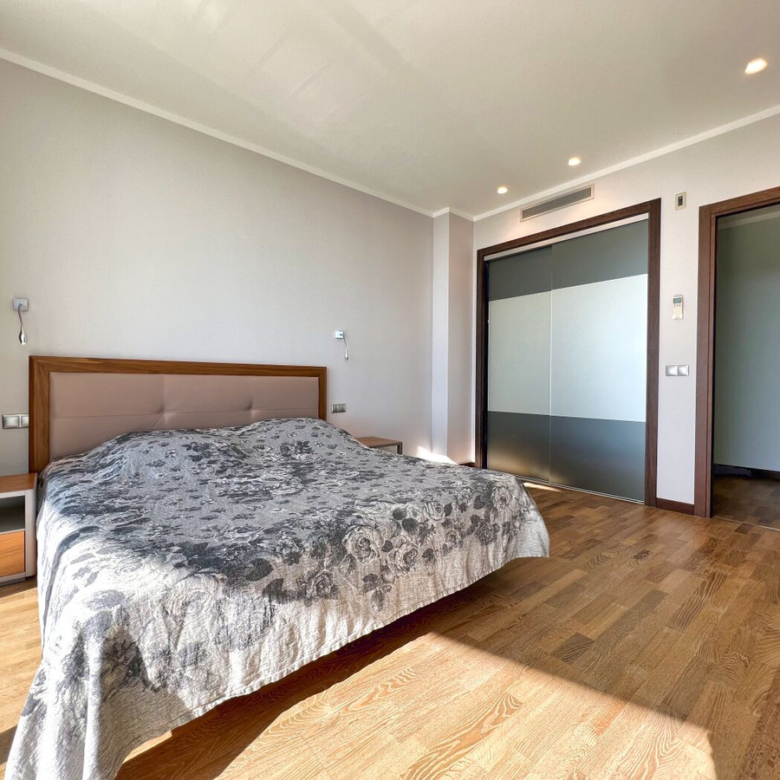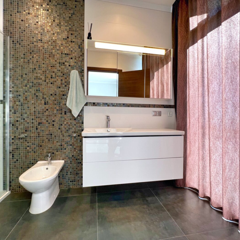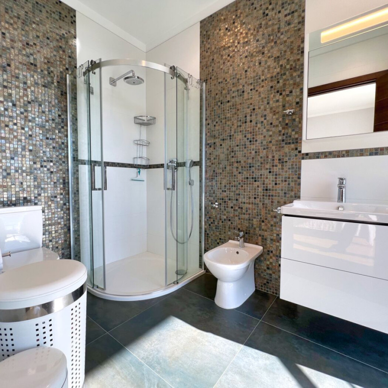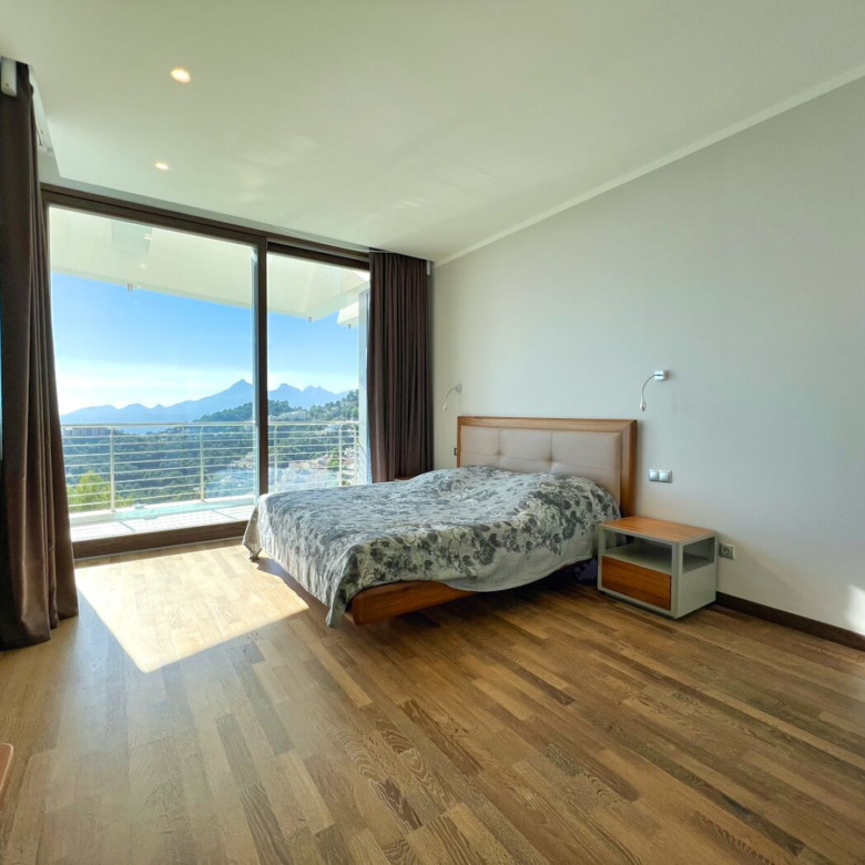 La villa est équipée de meubles design (Rolf Benz), de rideaux électriques, d’armoires encastrées, d’un chauffage par le sol (AEROTERMIA), de portails automatiques, de la climatisation, d’un système d’alarme, etc. La façade de la villa et même la clôture, les murs de soutènement et les murs de l’escalier sont revêtus de pierre naturelle de couleur beige clair CALISA.