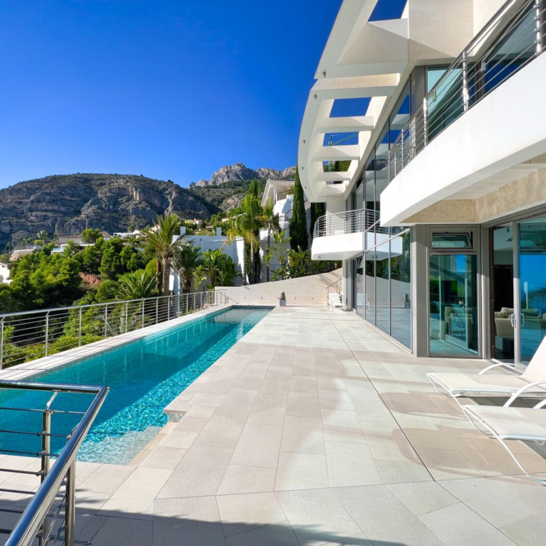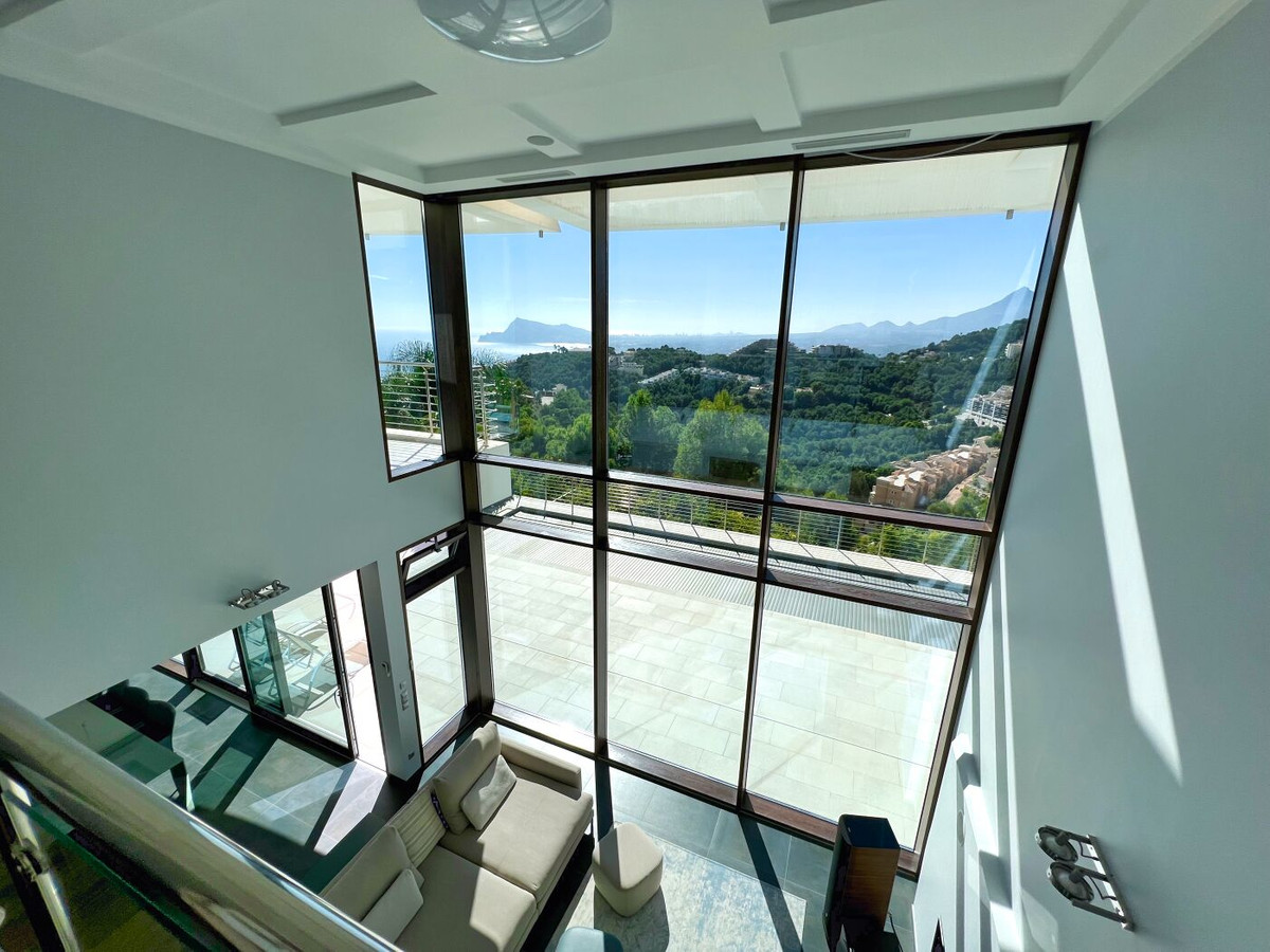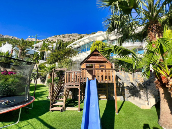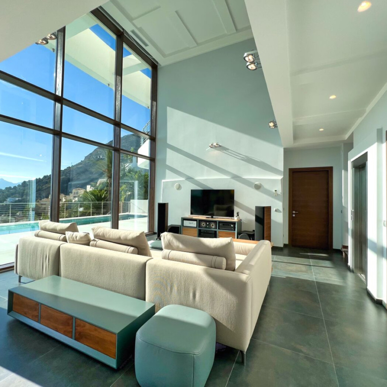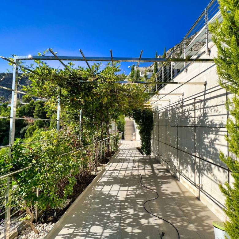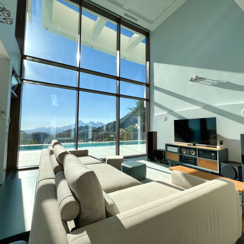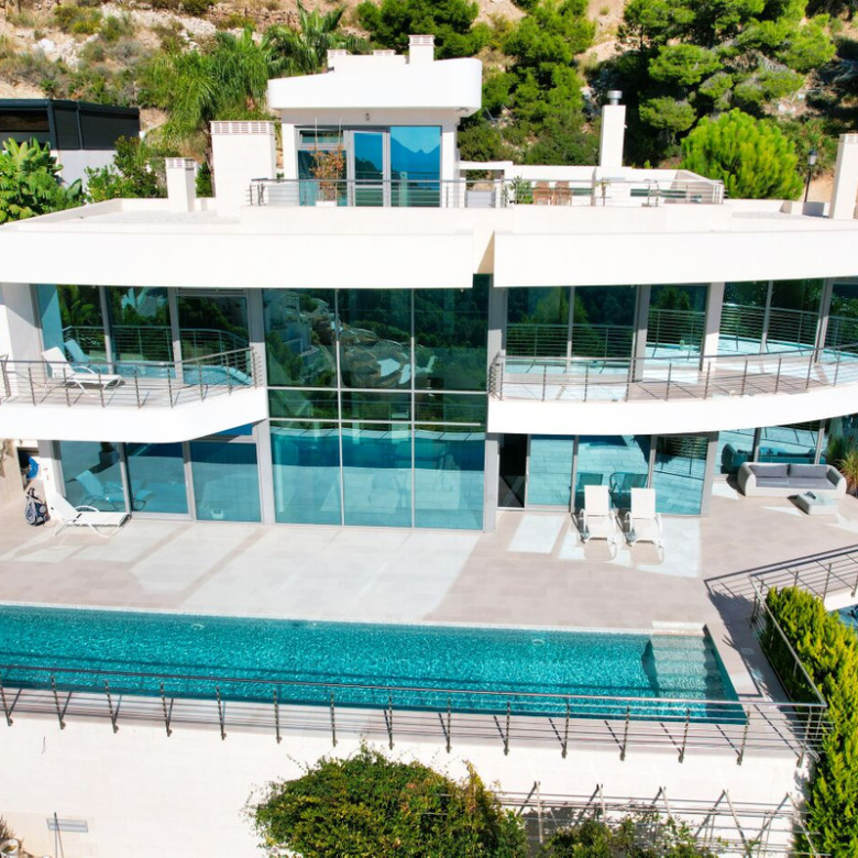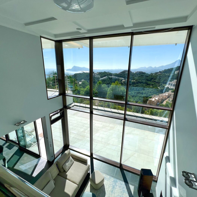 Cette villa moderne de première classe offre une vue panoramique sur la baie d’Altea et sur Benidorm. Elle est située dans la communauté fermée d’Altea Hills avec une sécurité 24h/24 et 7j/7, à côté d’installations de luxe telles qu’un club de tennis, un terrain de golf, un port de plaisance et un complexe thermal 5 étoiles. La villa est située dans la zone la plus calme d’Altea Hills, où vous ne pouvez pas entendre l’AP-7. Lorsque vous regardez la villa pour la première fois depuis la rue, vous voyez la cabine du capitaine, et les fenêtres teintées vertes et bleues allongées, et vous réalisez qu’elle ressemble à un voilier ! La façade principale de 24 m de long et 7 m de haut est entièrement réalisée en aluminium et en bois avec de très bonnes propriétés thermiques et techniques ! L’aluminium à l’extérieur protège le bois du soleil et l’intérieur est en chêne canadien avec un traitement décoratif spécial ! La villa comprend des meubles de designers : Villeroy & Boch, Duravit, Rolf Benz., est vendue entièrement meublée, et est prête à emménager ! La maison a un total de 323 m2 construits sur un terrain de 988 m2 et est distribuée sur quatre étages reliés par un escalier interne et un ascenseur pour six personnes.