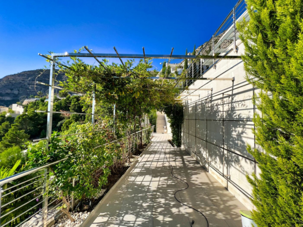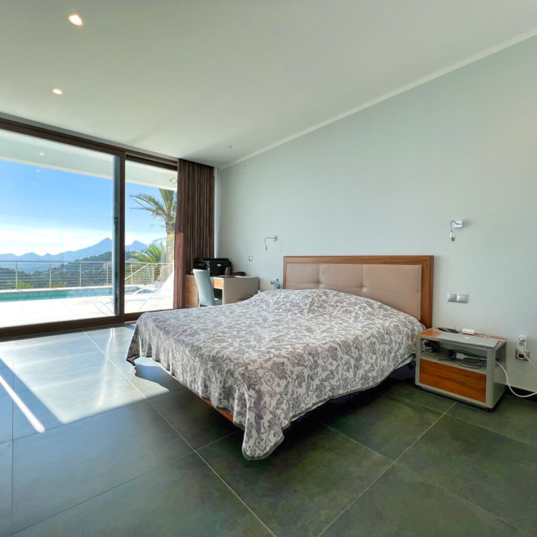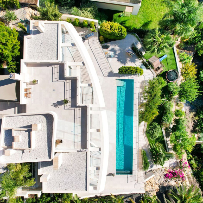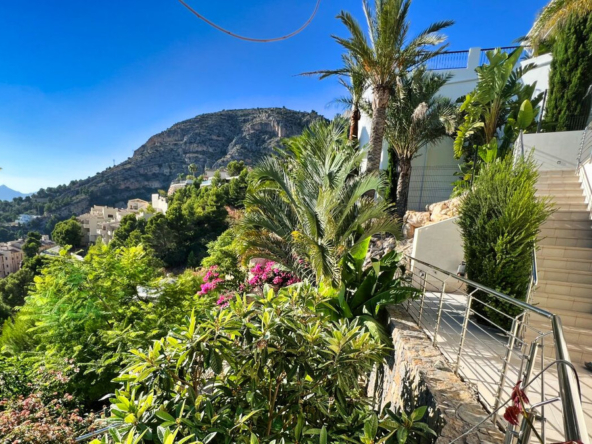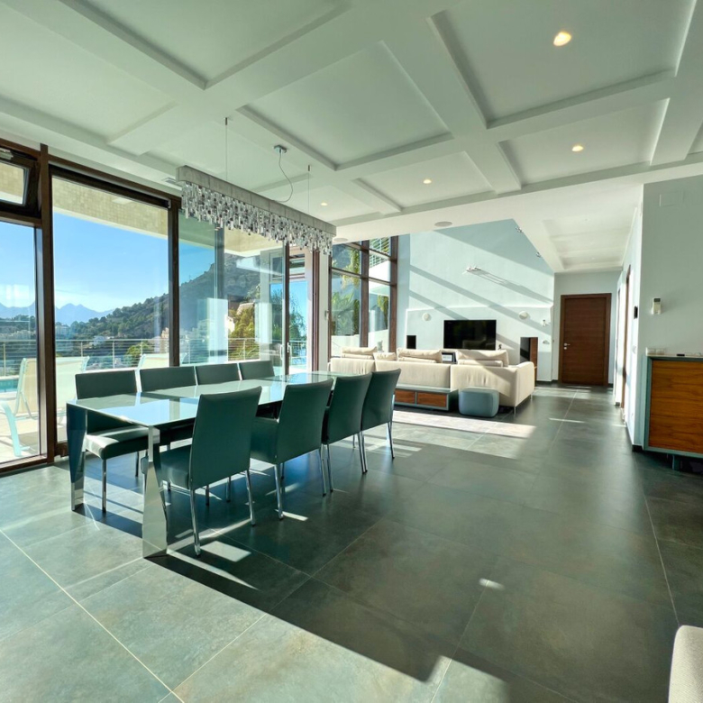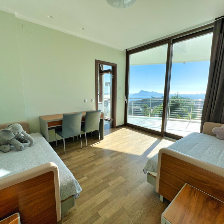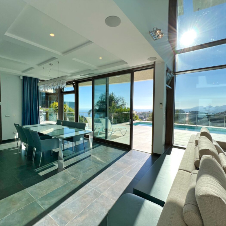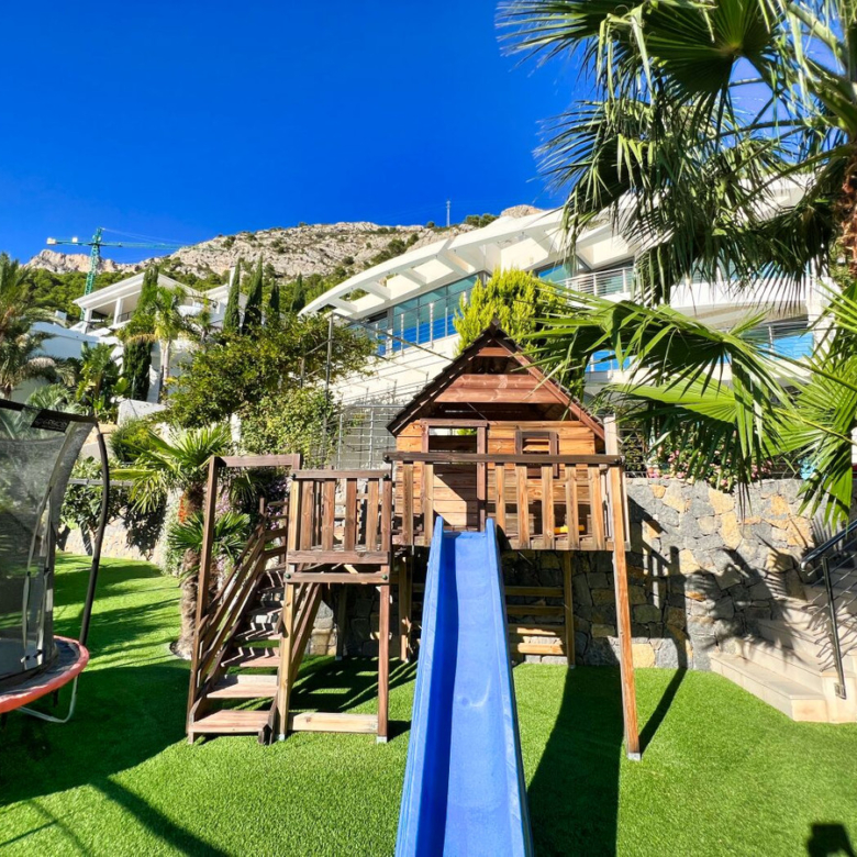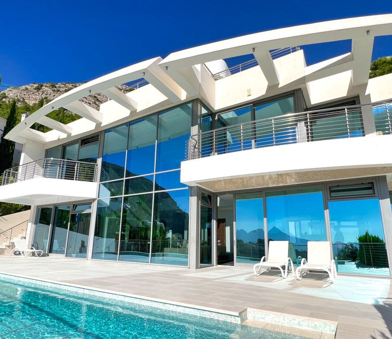 Cette villa moderne de première classe offre une vue panoramique sur la baie d’Altea et sur Benidorm. Elle est située dans la communauté fermée d’Altea Hills avec une sécurité 24h/24 et 7j/7, à côté d’installations de luxe telles qu’un club de tennis, un terrain de golf, un port de plaisance et un complexe thermal 5 étoiles. La villa est située dans la zone la plus calme d’Altea Hills, où vous ne pouvez pas entendre l’AP-7. Lorsque vous regardez la villa pour la première fois depuis la rue, vous voyez la cabine du capitaine, et les fenêtres teintées vertes et bleues allongées, et vous réalisez qu’elle ressemble à un voilier ! La façade principale de 24 m de long et 7 m de haut est entièrement réalisée en aluminium et en bois avec de très bonnes propriétés thermiques et techniques ! L’aluminium à l’extérieur protège le bois du soleil et l’intérieur est en chêne canadien avec un traitement décoratif spécial ! La villa comprend des meubles de designers : Villeroy & Boch, Duravit, Rolf Benz., est vendue entièrement meublée, et est prête à emménager ! La maison a un total de 323 m2 construits sur un terrain de 988 m2 et est distribuée sur quatre étages reliés par un escalier interne et un ascenseur pour six personnes.
