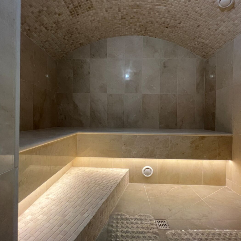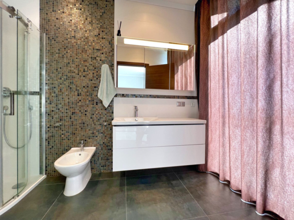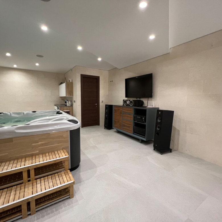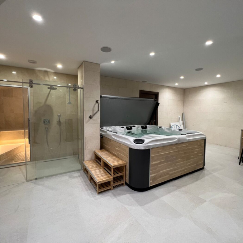 À l’extérieur, nous trouverons une piscine chauffée de 48 m2 à l’eau salée avec une couverture à commande électrique qui, même sans chauffage, augmente la température de l’eau à 4-5 degrés ! terrasses ensoleillées, deux abris pour voitures, et un jardin avec une aire de jeux.