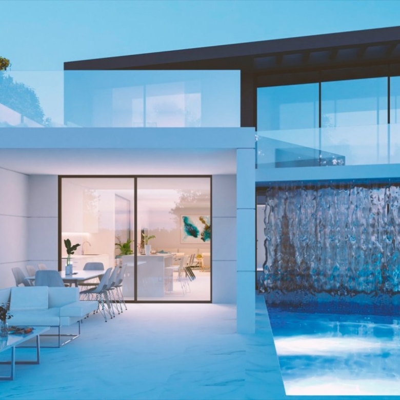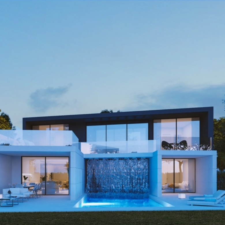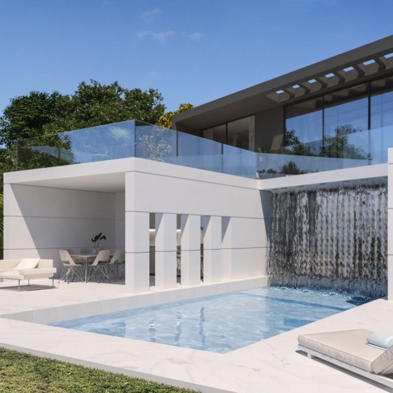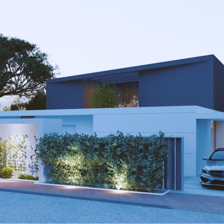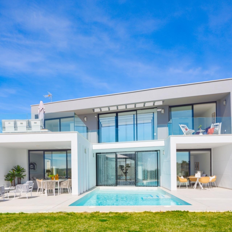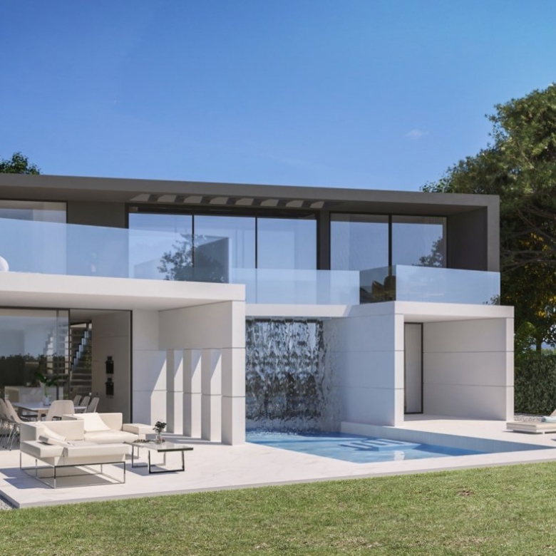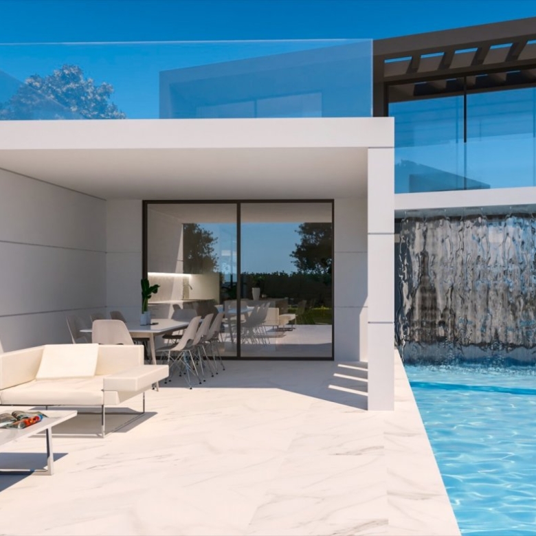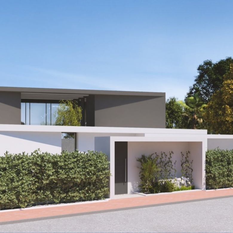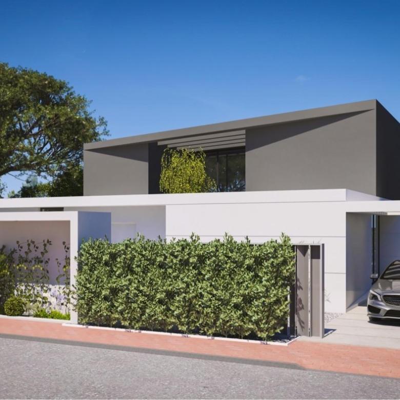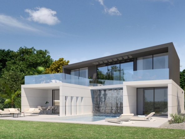 Nouvelle villa moderne distribuée sur 2 étages, avec 4 chambres, 4 salles de bains avec placards et terrasses, cuisine ouverte sur le salon avec de grandes fenêtres et accès direct au jardin avec piscine et parking.