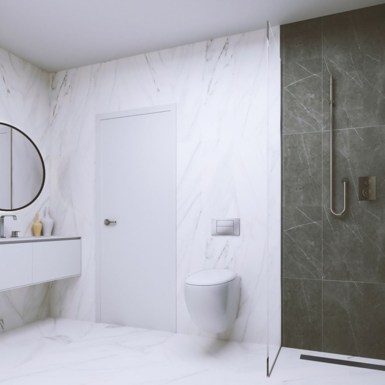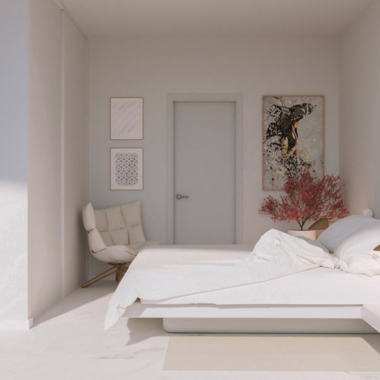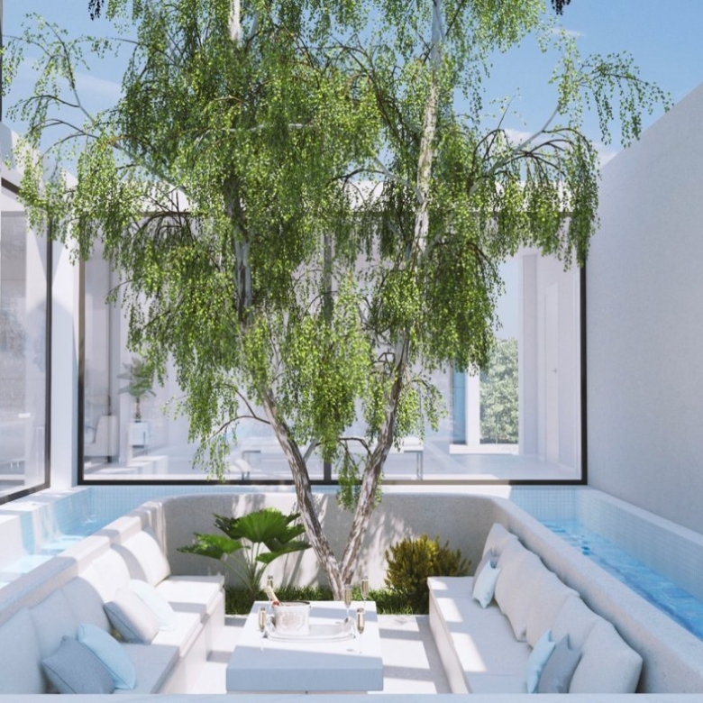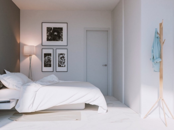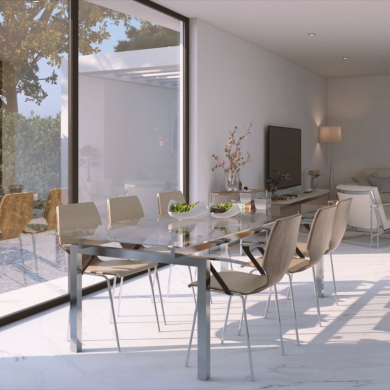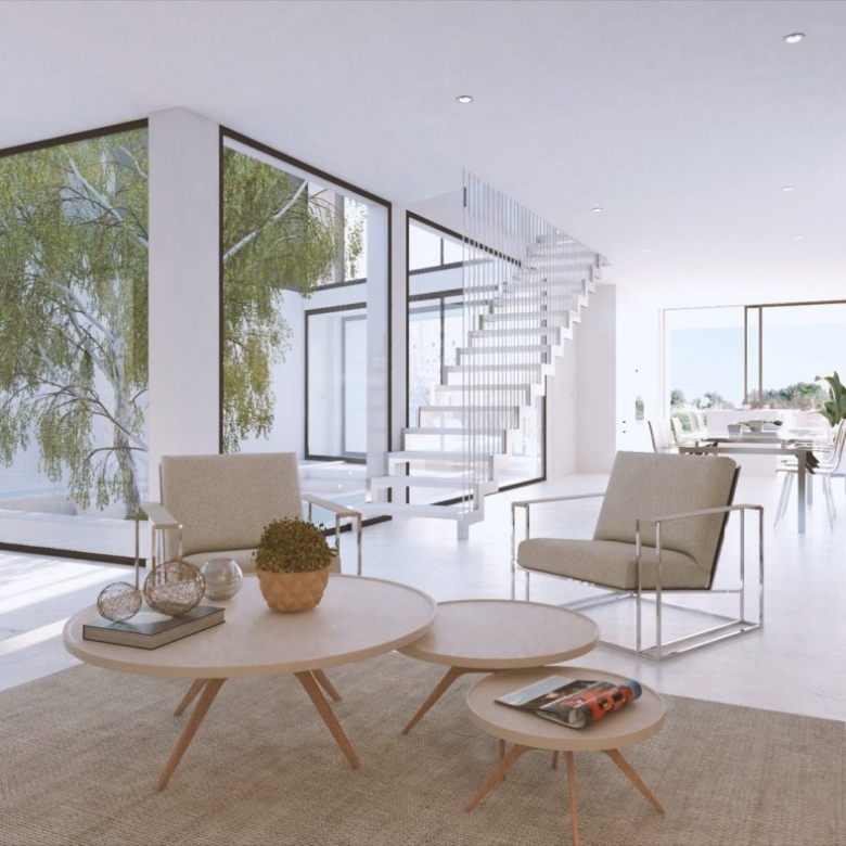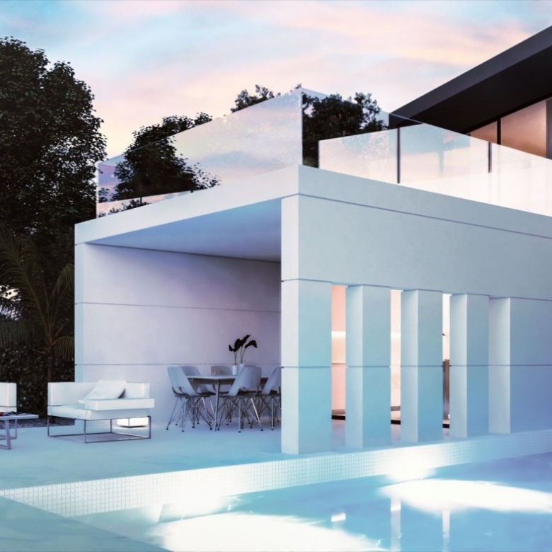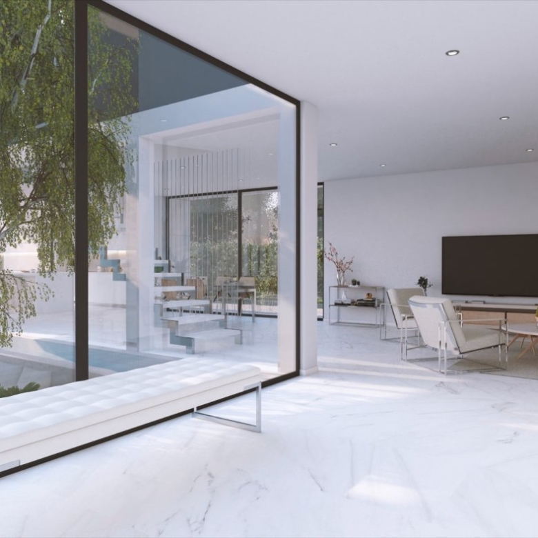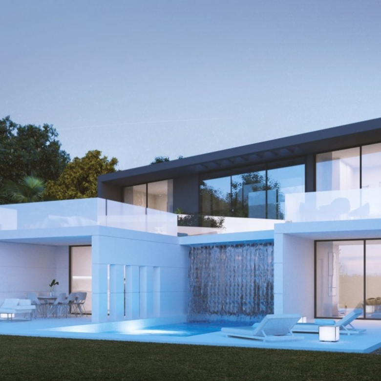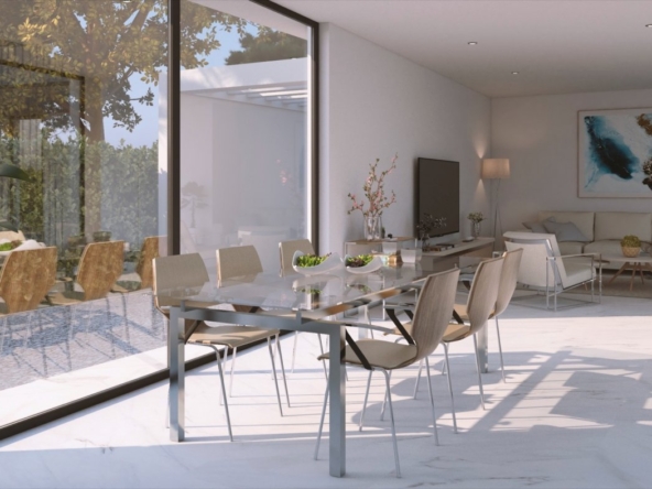 Nouvelle villa moderne distribuée sur 2 étages, avec 4 chambres, 4 salles de bains avec placards et terrasses, cuisine ouverte sur le salon avec de grandes fenêtres et accès direct au jardin avec piscine et parking.