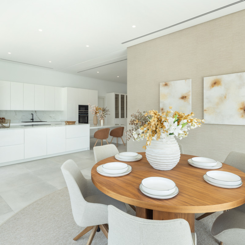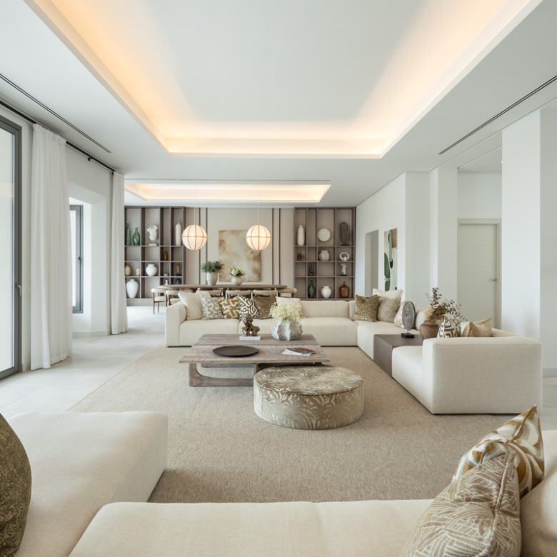 L’intérieur de la villa est conçu avec un accent sur le luxe et le confort. Avec cinq chambres et sept salles de bains, chaque espace est soigneusement planifié pour offrir un confort maximal. Les chambres disposent de placards intégrés, offrant un rangement efficace et élégant. La villa est équipée de la climatisation et du chauffage par le sol, assurant une ambiance agréable tout au long de l’année. La distribution comprend un garage privé, garantissant confort et sécurité pour les véhicules. Le design intérieur se concentre sur la fonctionnalité et le style, créant une maison accueillante et moderne.