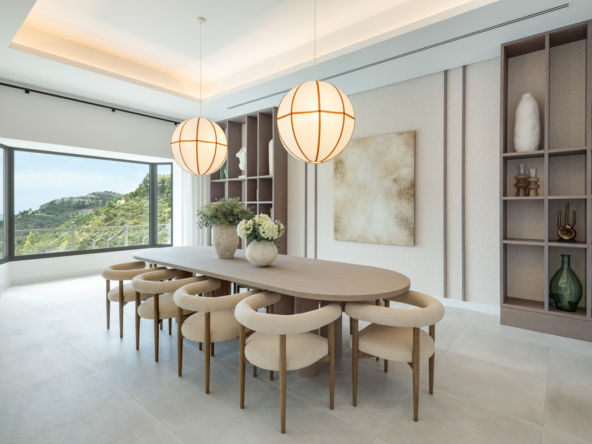 L’extérieur de la villa est conçu pour maximiser le plaisir du climat méditerranéen. Il dispose d’un vaste jardin privé qui offre un espace idéal pour les loisirs en plein air et la détente. La terrasse, parfaitement intégrée à l’environnement, offre un lieu exceptionnel pour profiter des vues et de l’air libre. De plus, la villa dispose d’une piscine privée, un élément essentiel pour se rafraîchir pendant les chaudes journées d’été. Le design du jardin et de la piscine se complètent pour offrir un oasis de tranquillité et de beauté.
