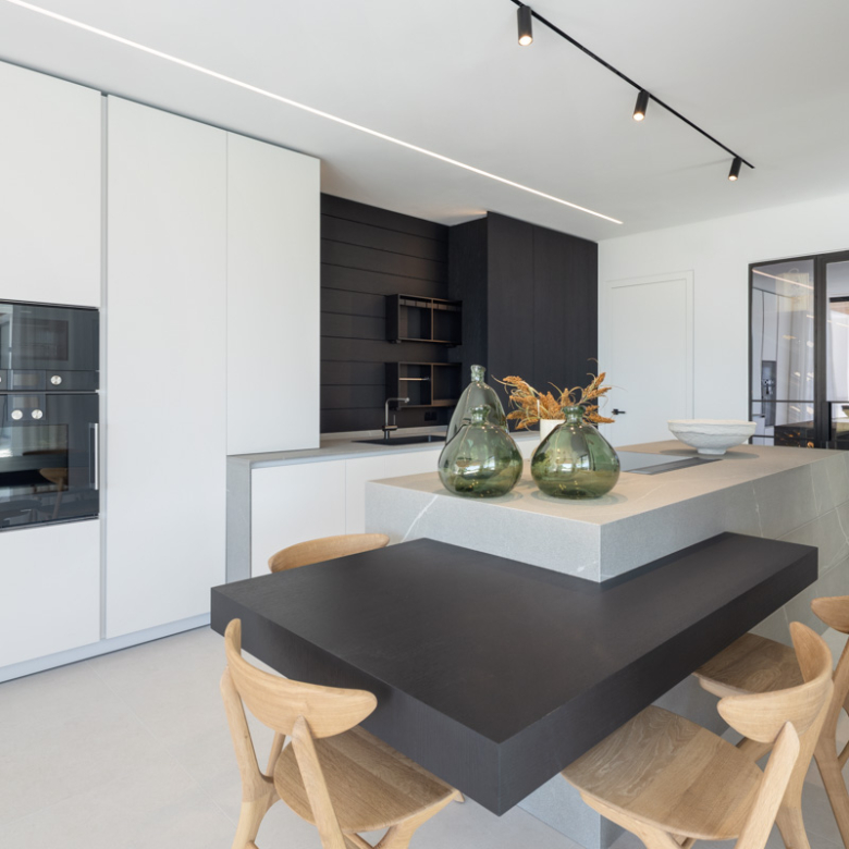 L’intérieur de la villa est conçu pour offrir un confort et une fonctionnalité maximaux. Les sols en grès cérame apportent une touche d’élégance et sont faciles à entretenir. La villa est équipée d’un système de domotique qui permet de contrôler divers aspects de la maison de manière efficace et confortable. Les placards intégrés dans les chambres offrent un vaste espace de rangement, maintenant l’ordre et l’esthétique. Le spa privé est un luxe supplémentaire qui permet de profiter de moments de détente sans quitter la maison.