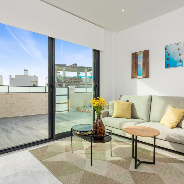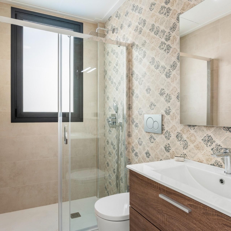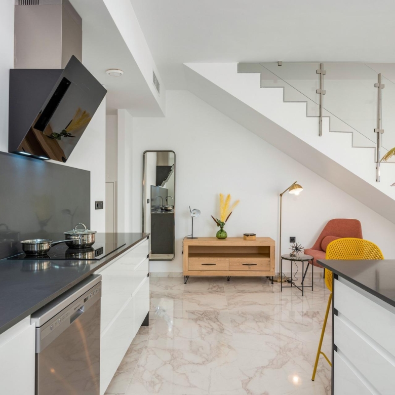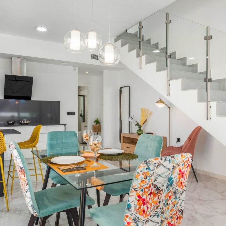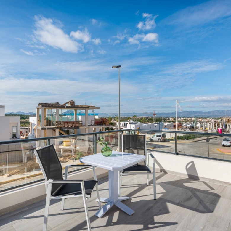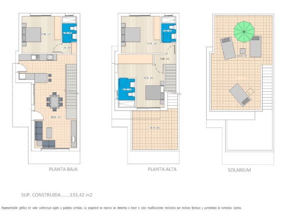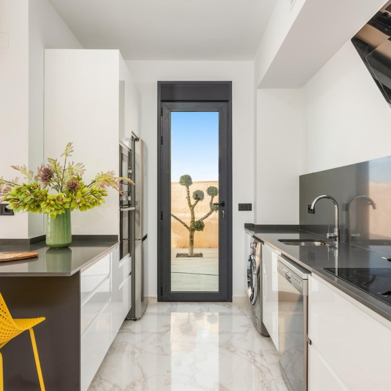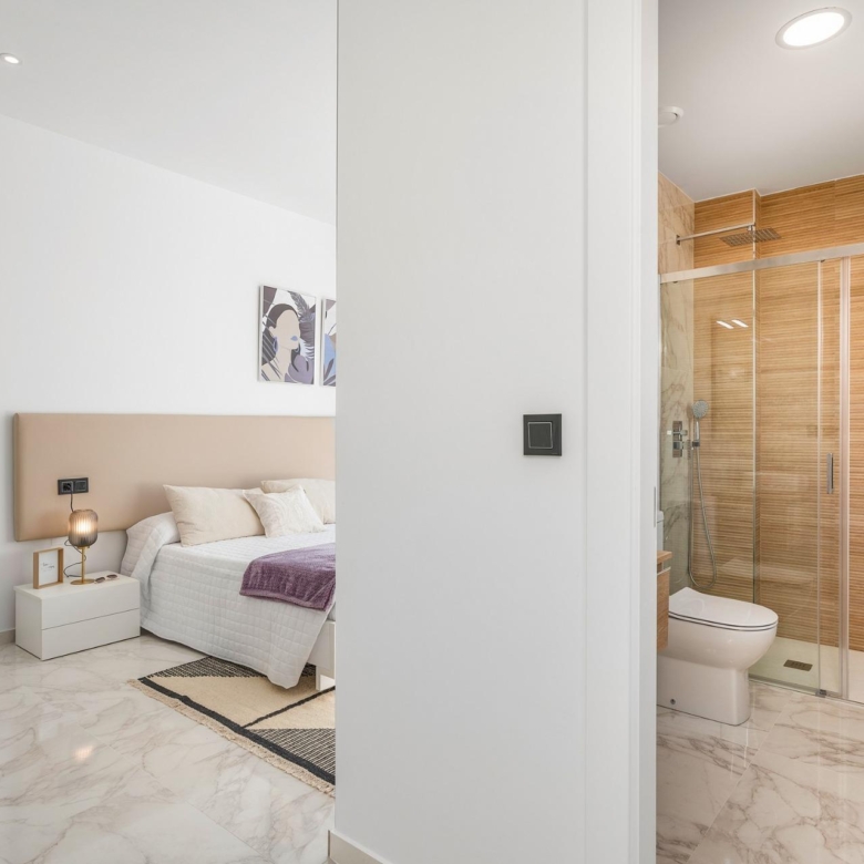 Maison jumelée avec 3 chambres, 3 salles de bain, cuisine ouverte sur le salon-salle à manger, terrain de 192 m2 avec piscine privée et une terrasse de 16 m2 au premier étage avec vue dégagée. Possibilité d’activer un solarium privé de 46 m2 avec un coût supplémentaire.