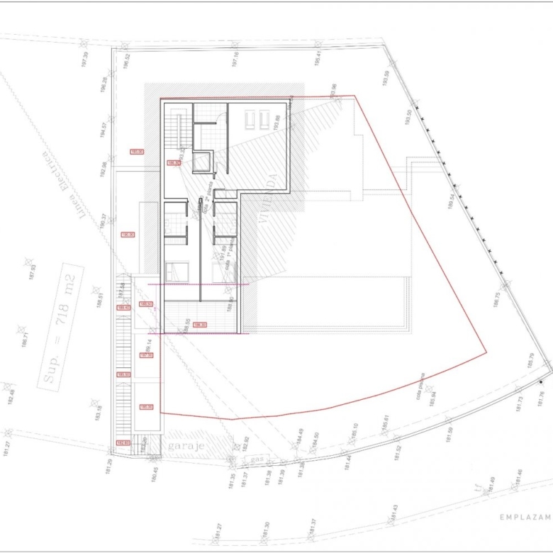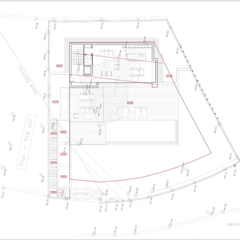 Cette villa, avec des finitions en béton apparent, a 4 étages qui sont reliés par un ascenseur et un escalier interne.