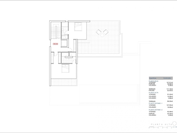 La cuisine est entièrement équipée et dispose d’un îlot de cuisson. Des portes coulissantes à hauteur de plafond donnent un accès direct à une terrasse spacieuse et à la piscine. L’étage supérieur contient deux chambres à coucher avec salles de bains attenantes et une terrasse.