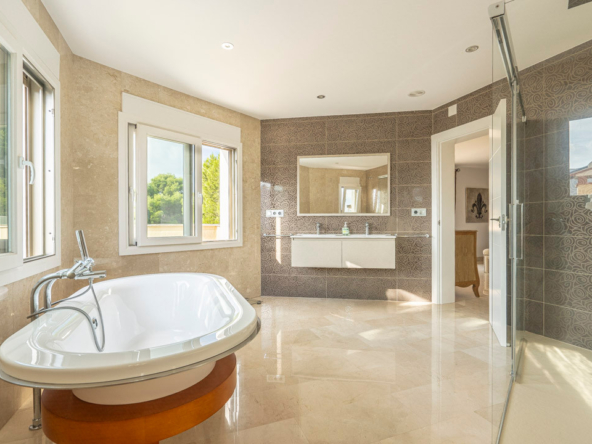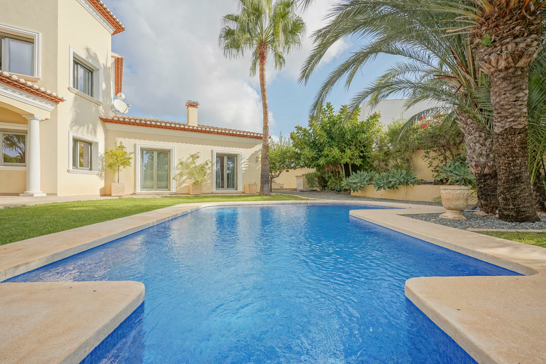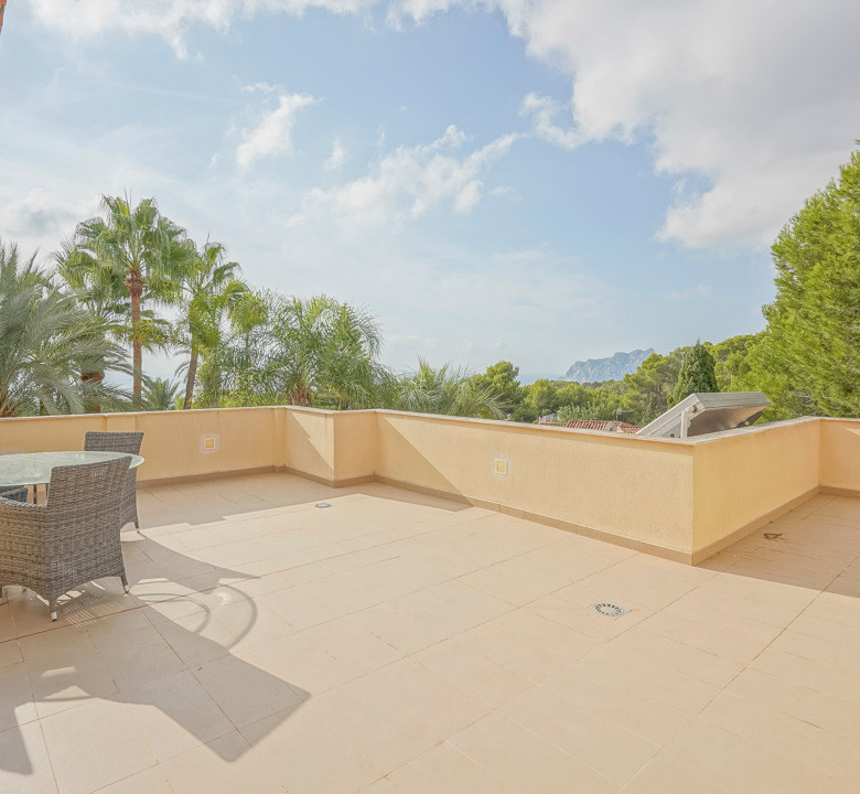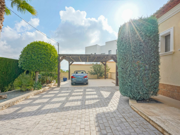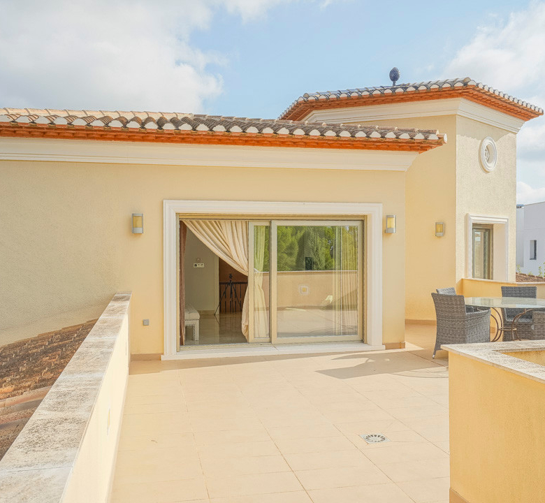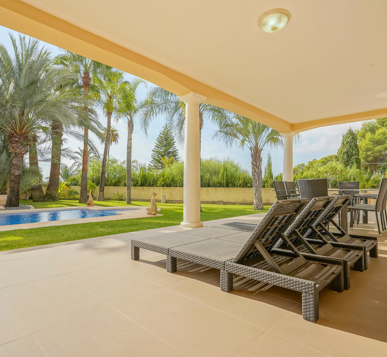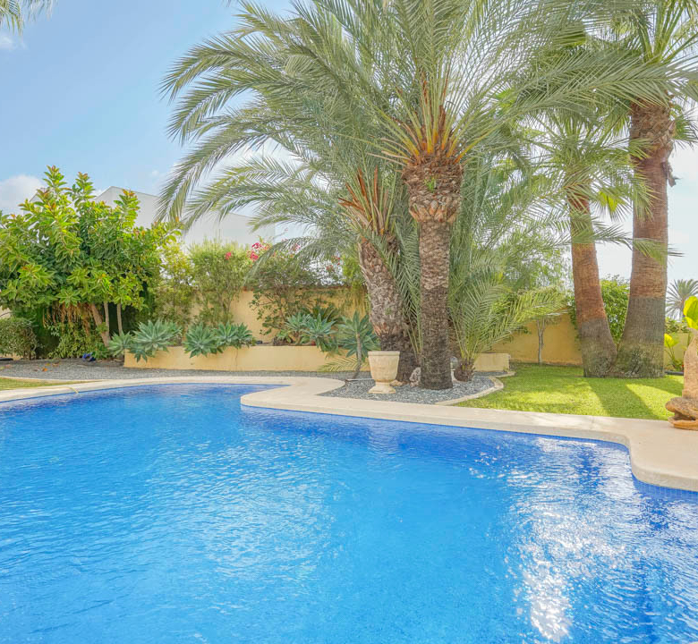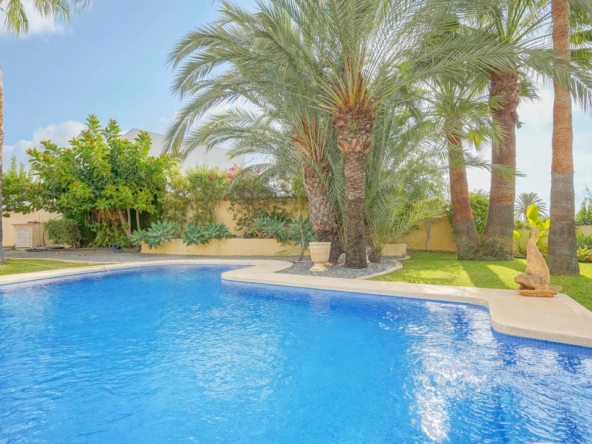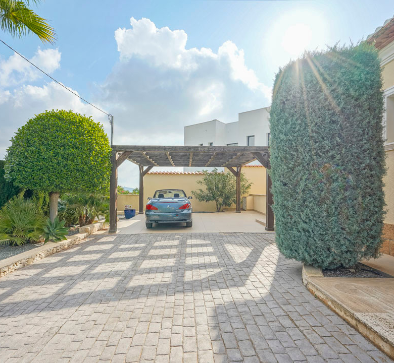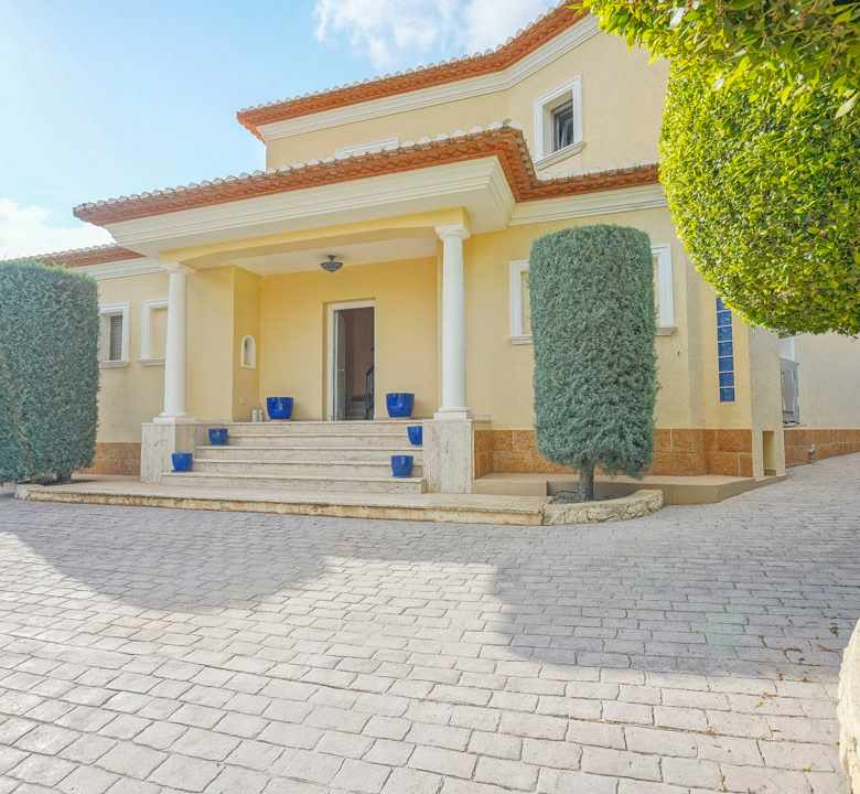 Cette villa espagnole traditionnelle est située dans un quartier calme de Benissa, à proximité de la côte. Le rez-de-chaussée comprend un salon-salle à manger spacieux, une cuisine moderne entièrement équipée et trois chambres doubles, chacune avec une salle de bains privée. La chambre principale se trouve au premier étage et dispose d’une salle de bains très spacieuse avec vue sur la mer, d’un dressing et d’une grande terrasse d’où l’on peut également profiter des magnifiques vues sur le Peñon de Ifach et la mer. Le salon et toutes les chambres du rez-de-chaussée ont un accès direct à la grande terrasse couverte grâce à des fenêtres coulissantes. Depuis la terrasse, vous avez une vue sur la grande piscine entourée d’un magnifique jardin méditerranéen avec plusieurs palmiers. De l’autre côté de la villa se trouve une grande allée avec un abri pour voiture et un espace de stationnement pour plusieurs voitures. Au sous-sol, il y a une autre buanderie et une salle de stockage. La villa est équipée d’un chauffage au sol, de l’air conditionné, de volets, d’un système d’irrigation automatique et de panneaux solaires. En moins de 5 minutes, vous atteignez la côte de Benissa où il y a plusieurs plages idylliques. En moins de 10 minutes, vous atteignez le village portuaire touristique de Moraira et en 15 minutes, vous êtes dans la ville balnéaire animée de Calpe.