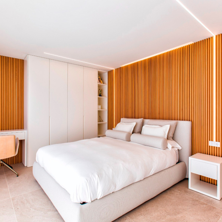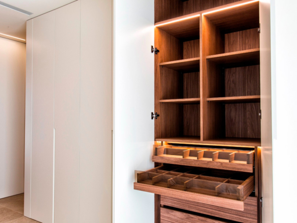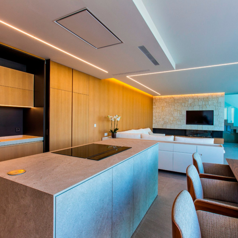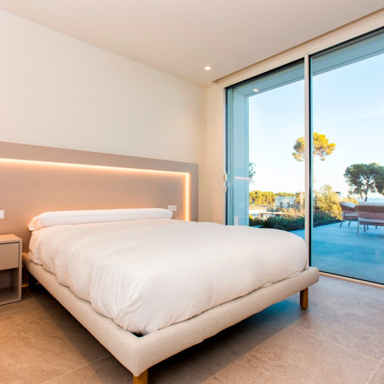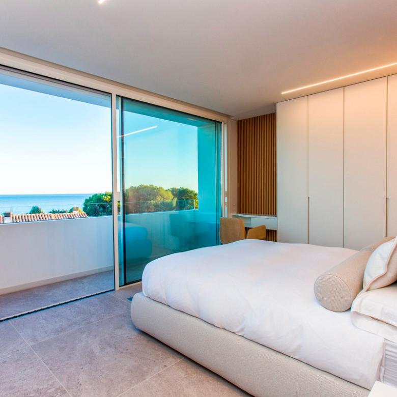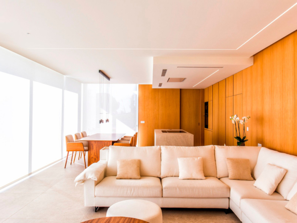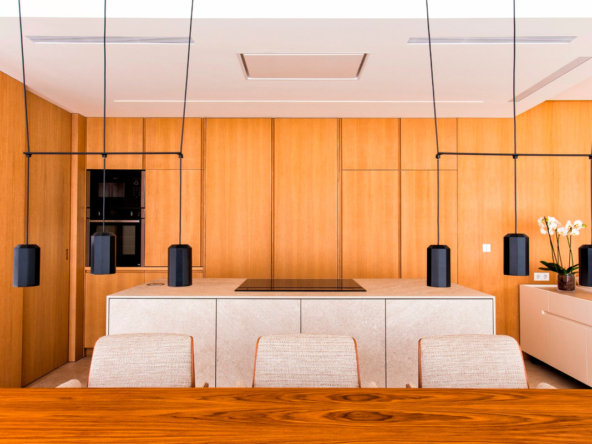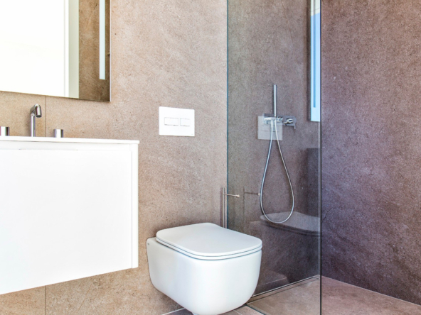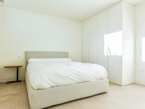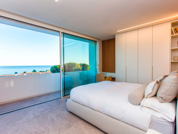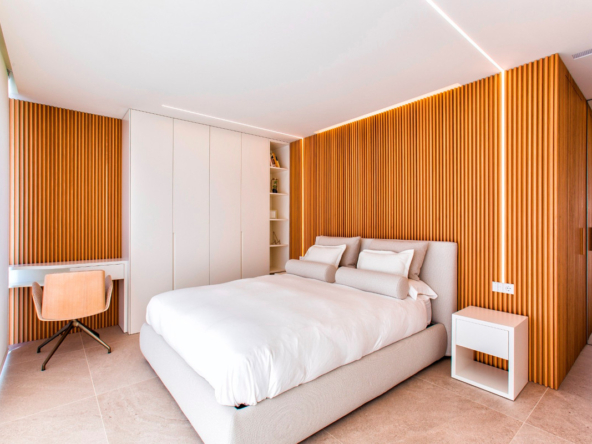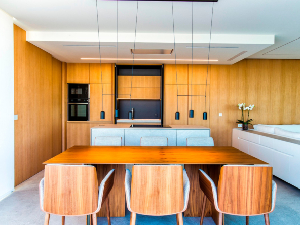 Le cœur de la villa est son espace de vie ouvert et aéré, où une cuisine gastronomique avec des armoires blanches élégantes et des accents de bois naturel s’intègre parfaitement dans un salon lumineux. D’immenses portes coulissantes en verre encadrent la piscine à débordement étincelante et les jardins entretenus, invitant l’extérieur à entrer et inondant l’espace de lumière du soleil. La terrasse extérieure, idéale pour les repas en plein air, surplombe le littoral azur, créant un cadre idyllique pour la détente.