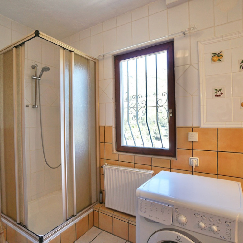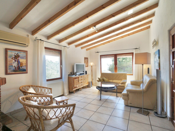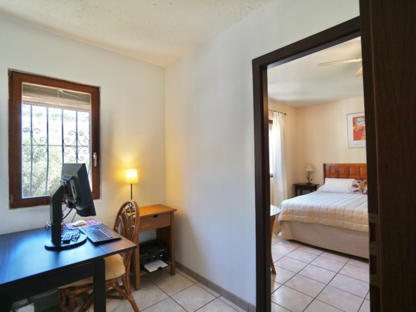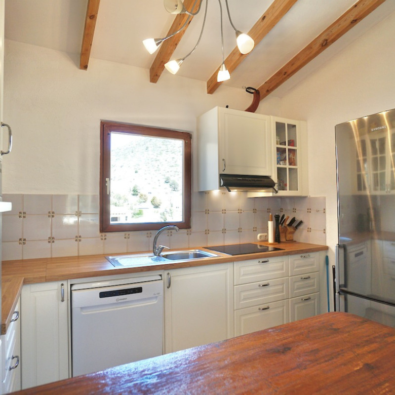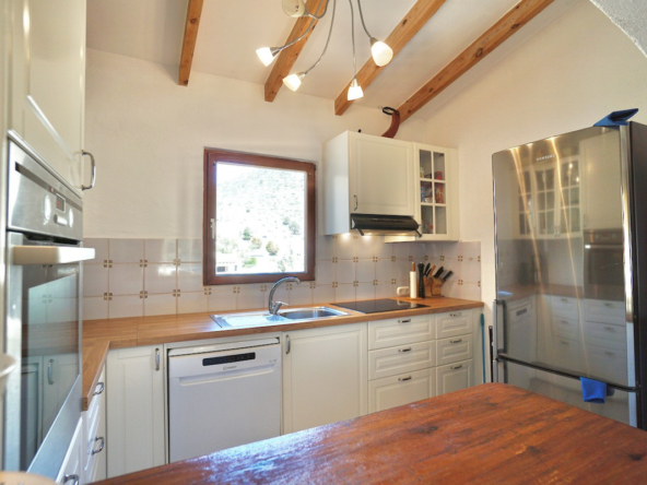 La propriété se trouve sur un terrain surélevé orienté sud, avec une belle vue dégagée sur la vallée et même un petit aperçu de la mer au loin. À l’intérieur, vous découvrirez un espace de vie lumineux et chaleureux, avec poutres apparentes, cheminée et une cuisine moderne toute équipée. Les chambres se trouvent à l’étage inférieur, dont une suite parentale avec espace dressing ou bureau.