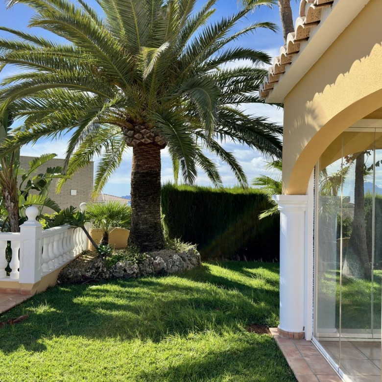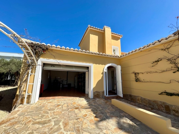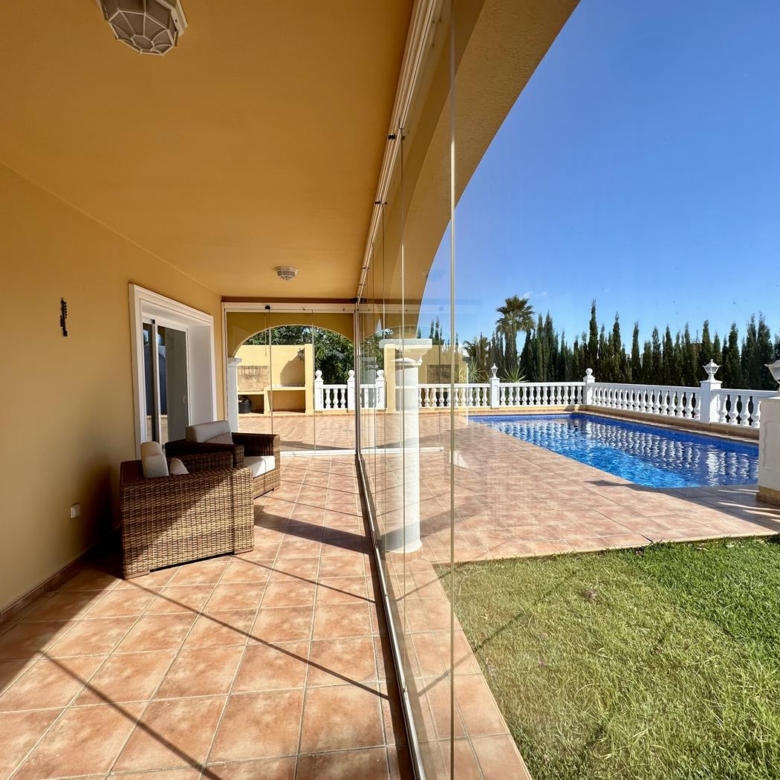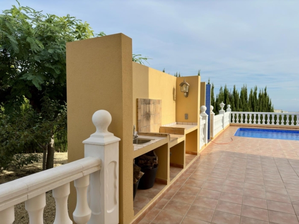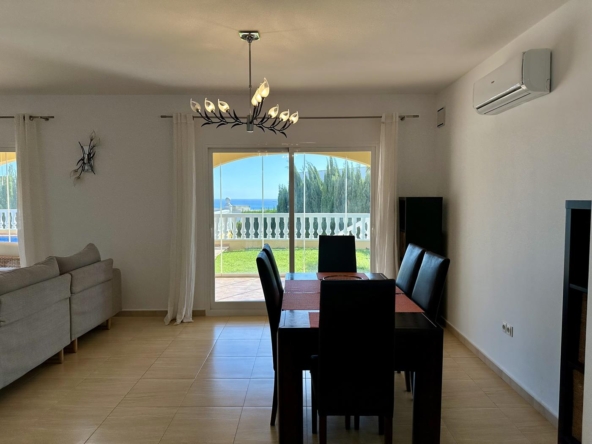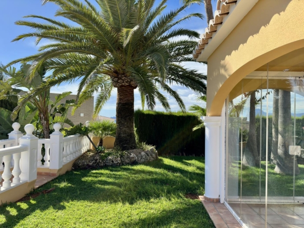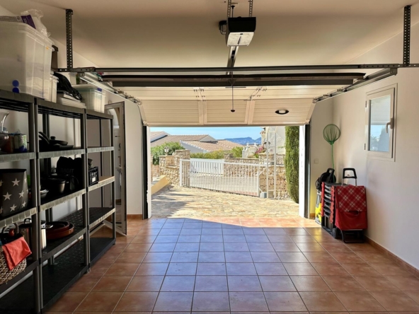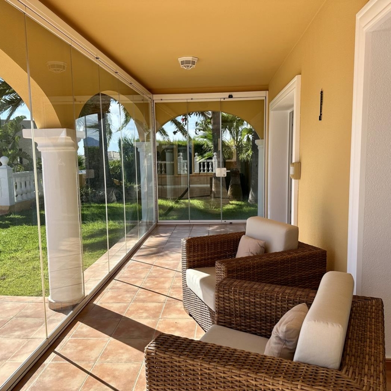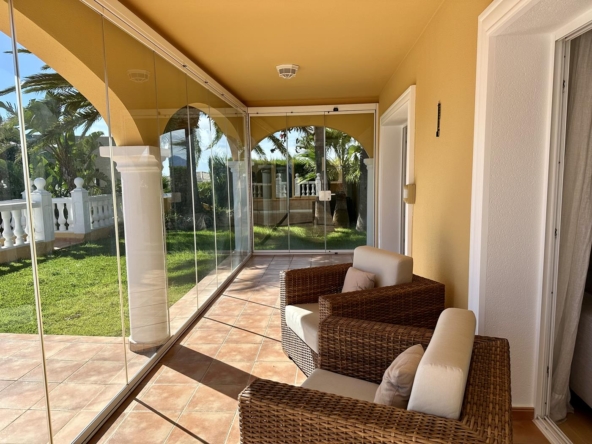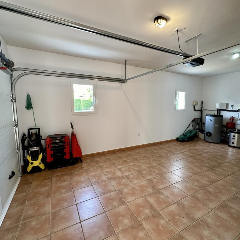 La villa dispose d’un grand salon-salle à manger-cuisine au rez-de-chaussée, avec terrasse vitrée et jardin avec pelouse, cuisine d’été et arbres fruitiers, garage et une salle de bains et terrasse avec piscine privée.