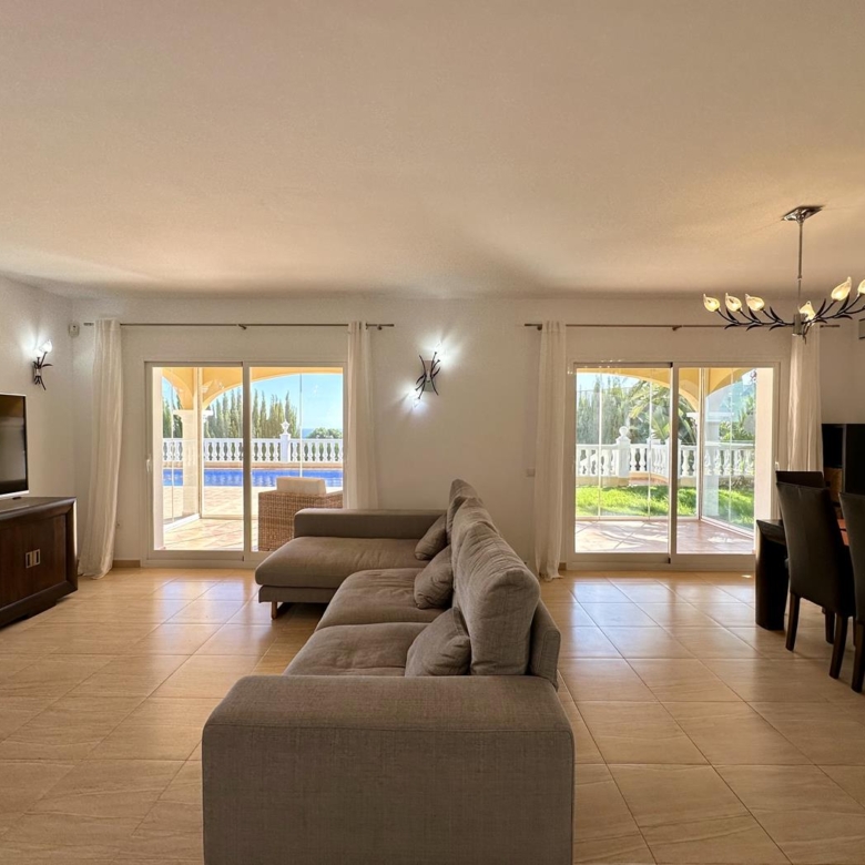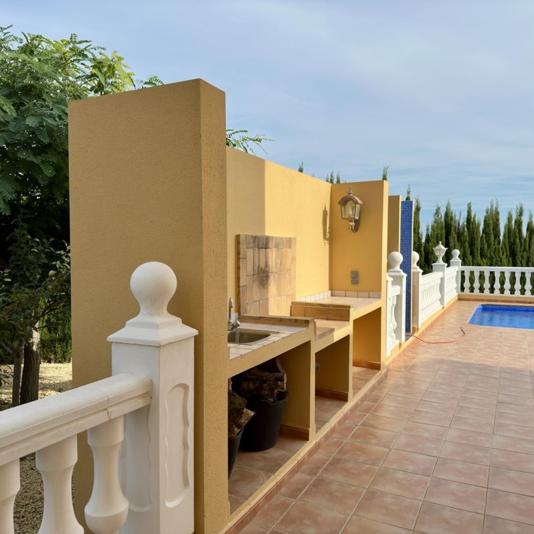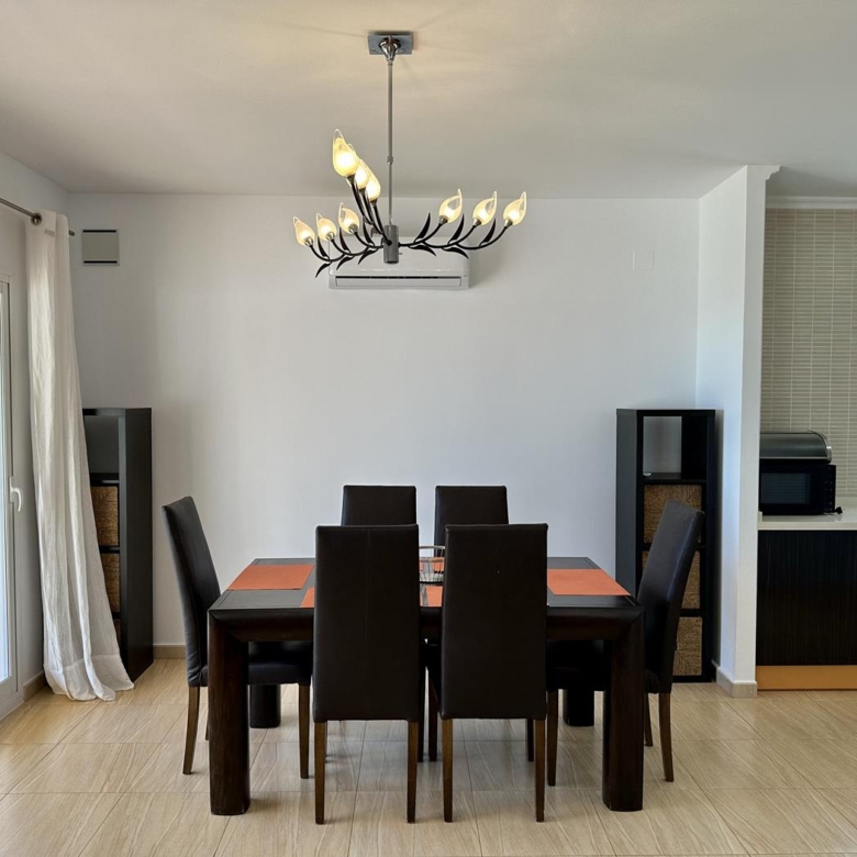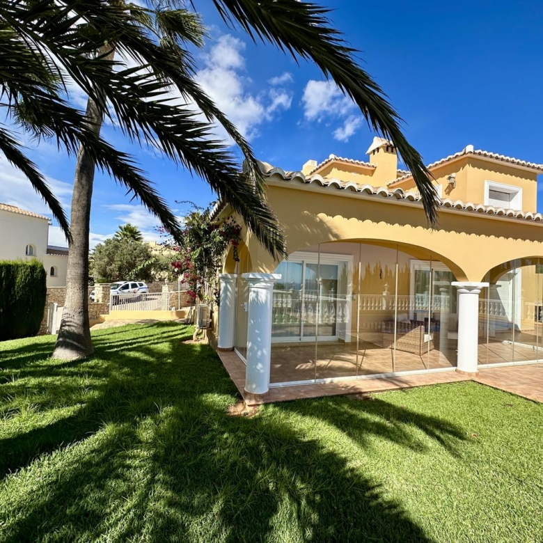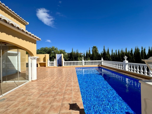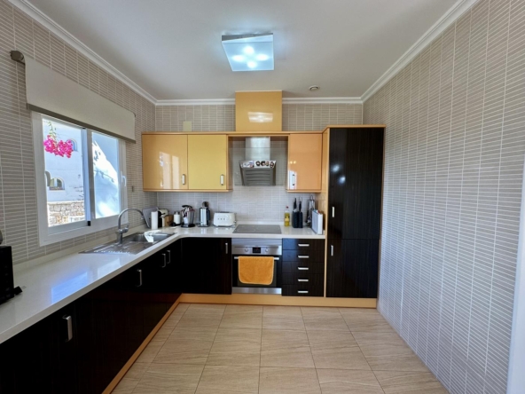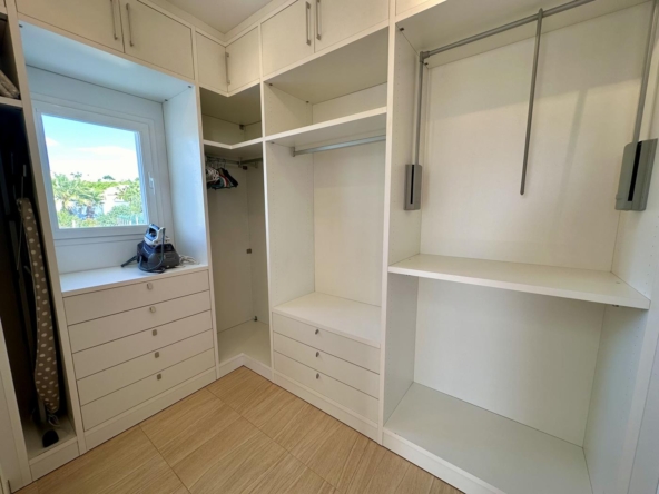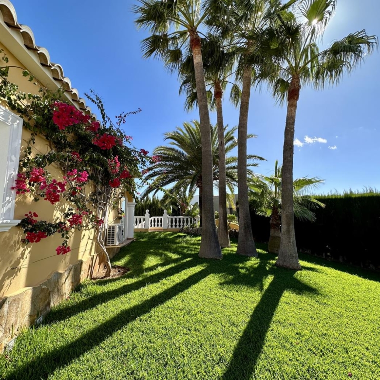 La villa dispose d’un grand salon-salle à manger-cuisine au rez-de-chaussée, avec terrasse vitrée et jardin avec pelouse, cuisine d’été et arbres fruitiers, garage et une salle de bains et terrasse avec piscine privée.
