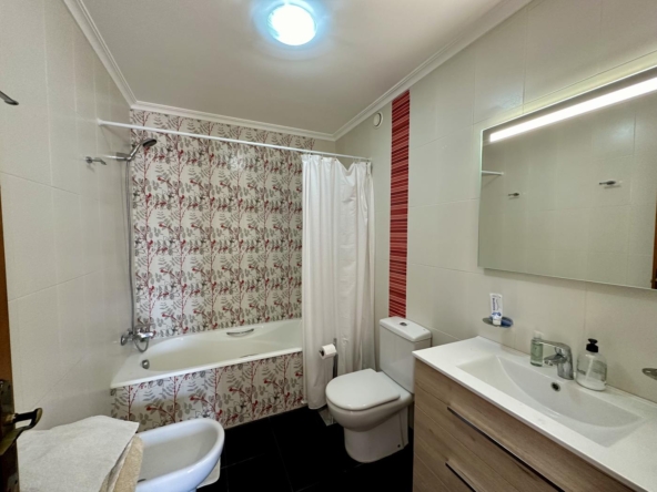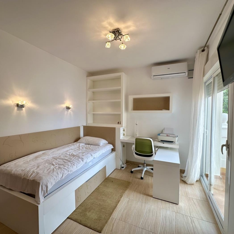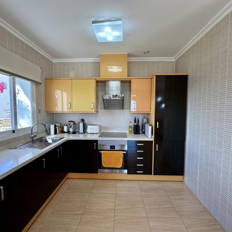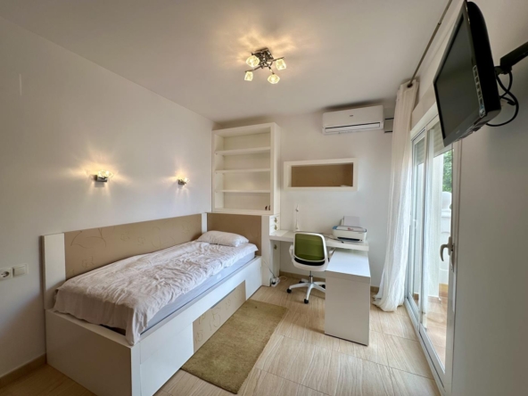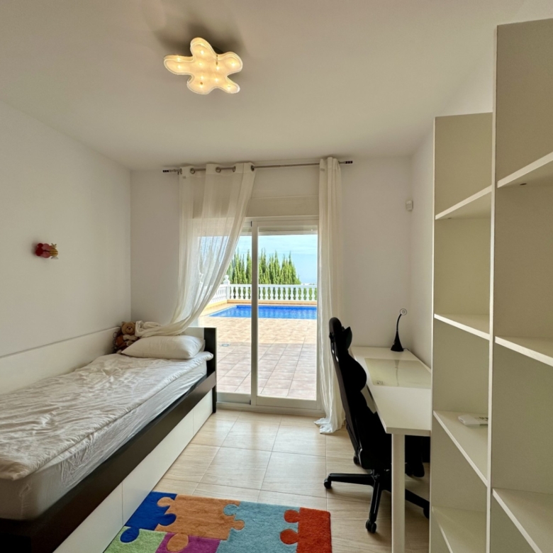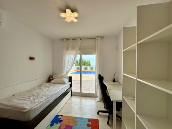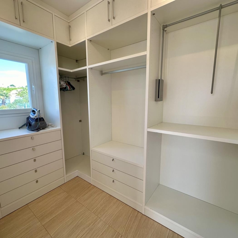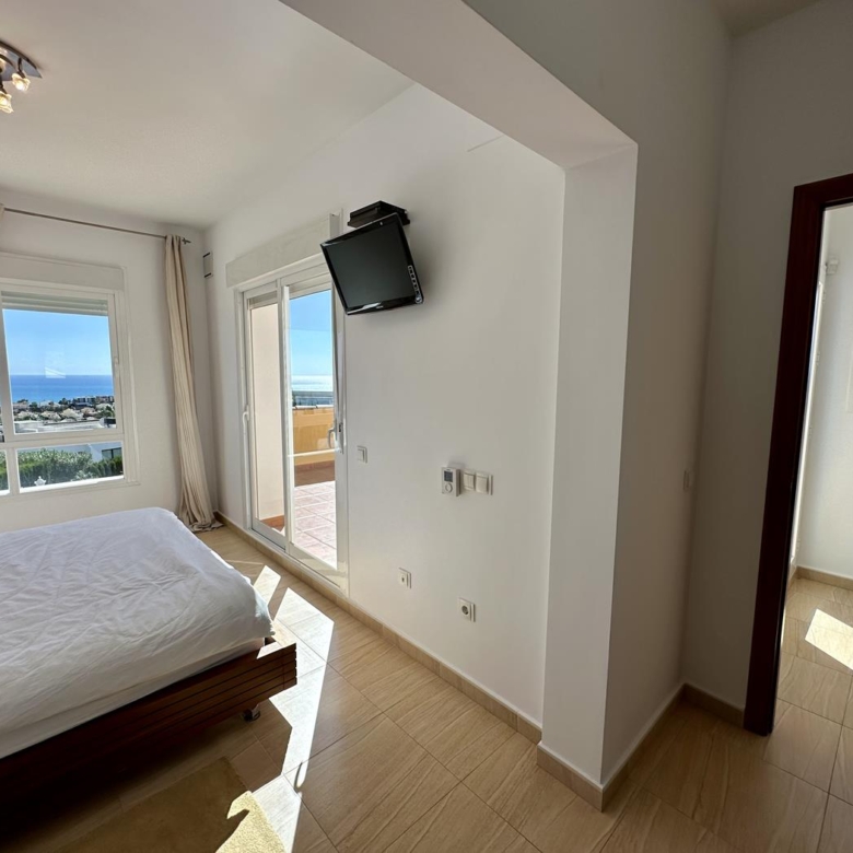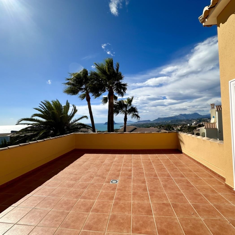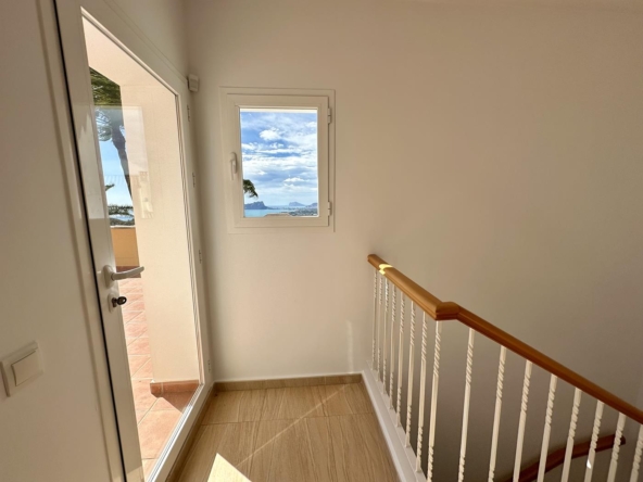 À l’étage supérieur, vous avez la chambre principale, avec dressing, salle de bains privative et terrasse privée avec vue sur la mer. La maison dispose du chauffage au sol et de la climatisation dans le salon et les chambres.