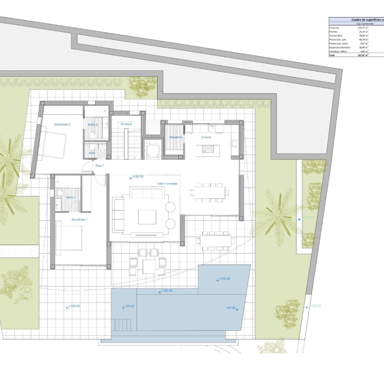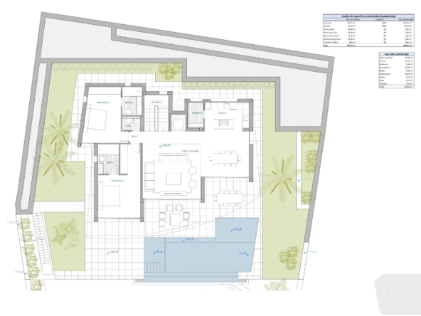 Cette villa est dotée d’équipements haut de gamme, notamment la menuiserie Technal avec verre de sécurité, l’éclairage LED, le chauffage par le sol, la climatisation et un système aérothermique pour l’eau chaude et le chauffage. Les autres équipements comprennent des stores électriques, des armoires encastrées, des systèmes d’alarme intérieurs et extérieurs, des caméras de sécurité pré-installées et une piscine à débordement de 10 x 3,3 m avec un espace barbecue. Orientée au sud pour une exposition optimale au soleil, cette villa est économe en énergie avec un classement A.