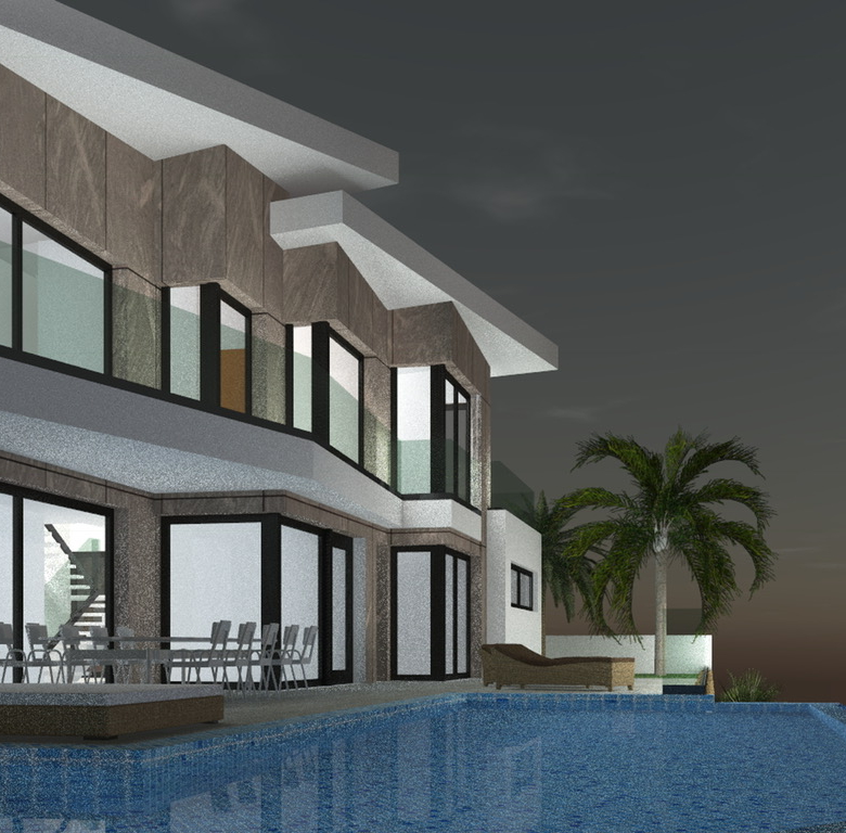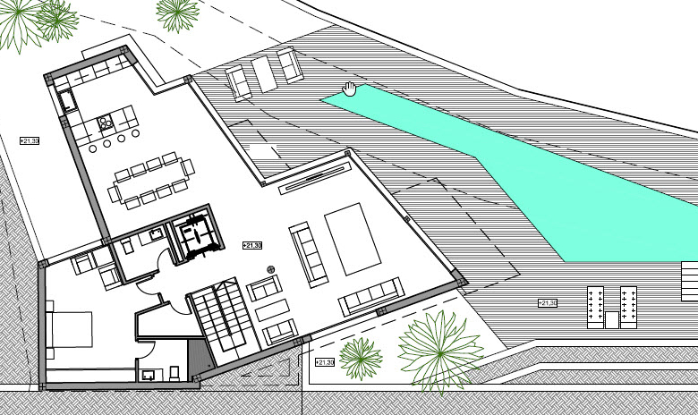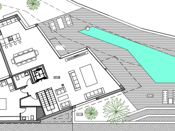 À l’extérieur, dans le jardin à faible entretien, il y a une terrasse spacieuse, une grande piscine à débordement avec douche de piscine et des murs en pierre naturelle ont été utilisés pour couvrir les différents niveaux.