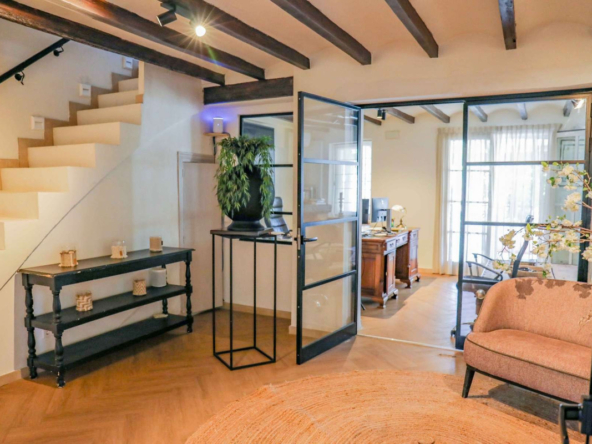 Située sur un terrain plat, la résidence se déploie sur deux étages spacieux. Le niveau principal comprend une cuisine moderne et élégante avec un îlot central, idéal pour les repas partagés et les rassemblements. A côté, une salle à manger raffinée avec une cheminée chaleureuse donne un ton accueillant, tandis qu’un couloir s’ouvre sur une pièce flexible servant actuellement de bureau, mais facilement adaptable comme une chambre supplémentaire. L’espace de vie aéré, inondé de lumière par des fenêtres surdimensionnées, invite à des moments de détente.