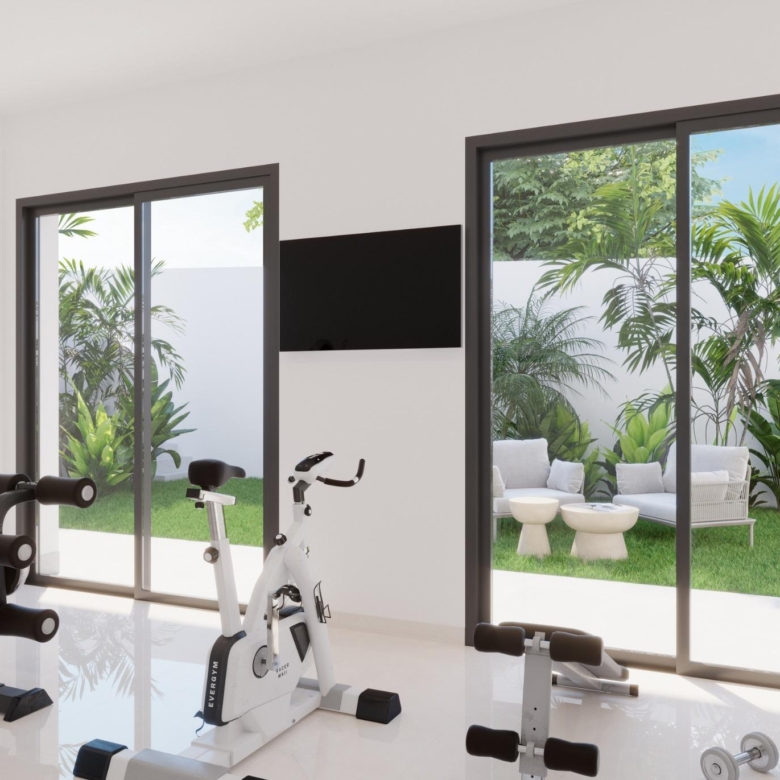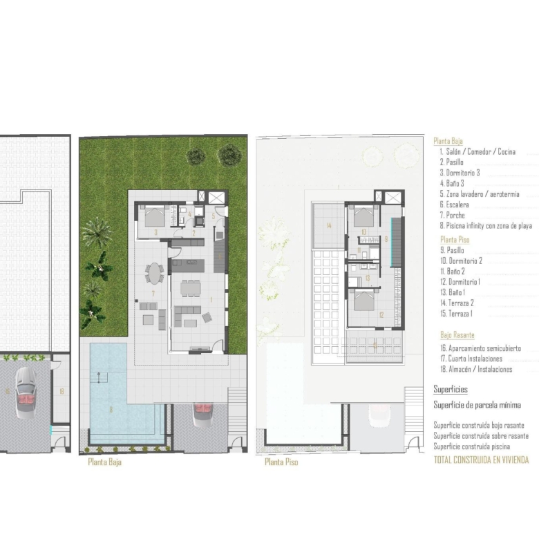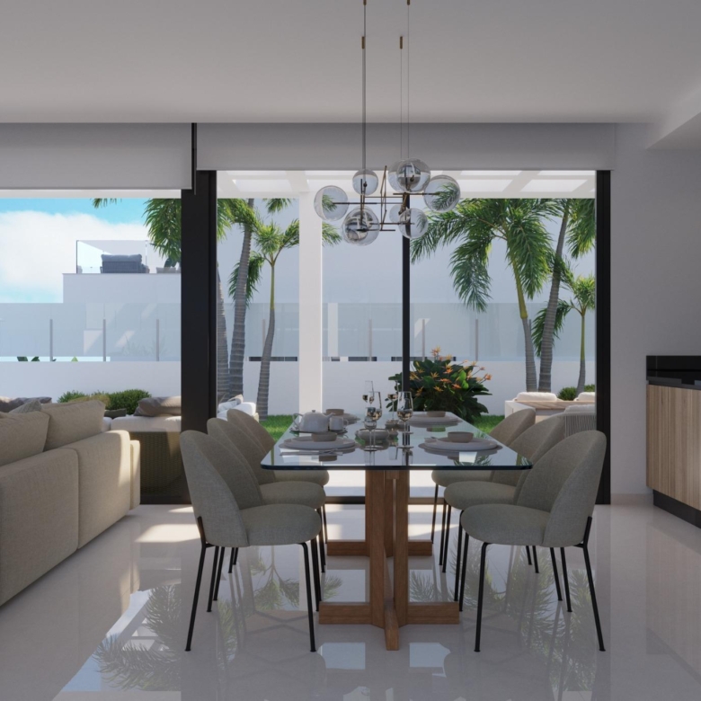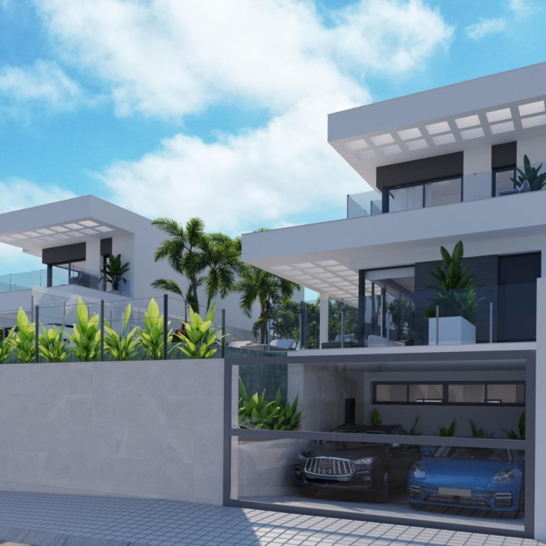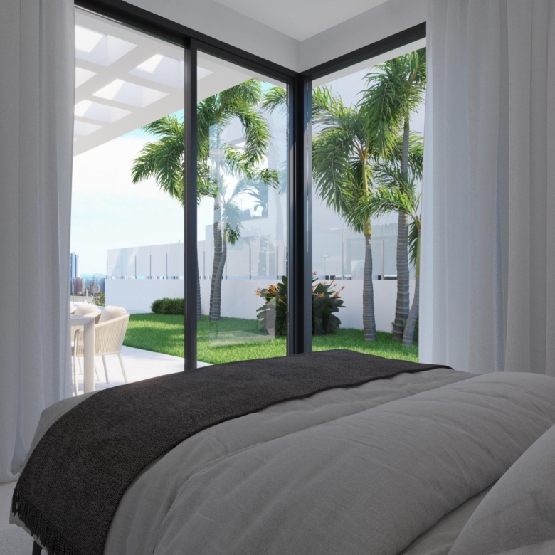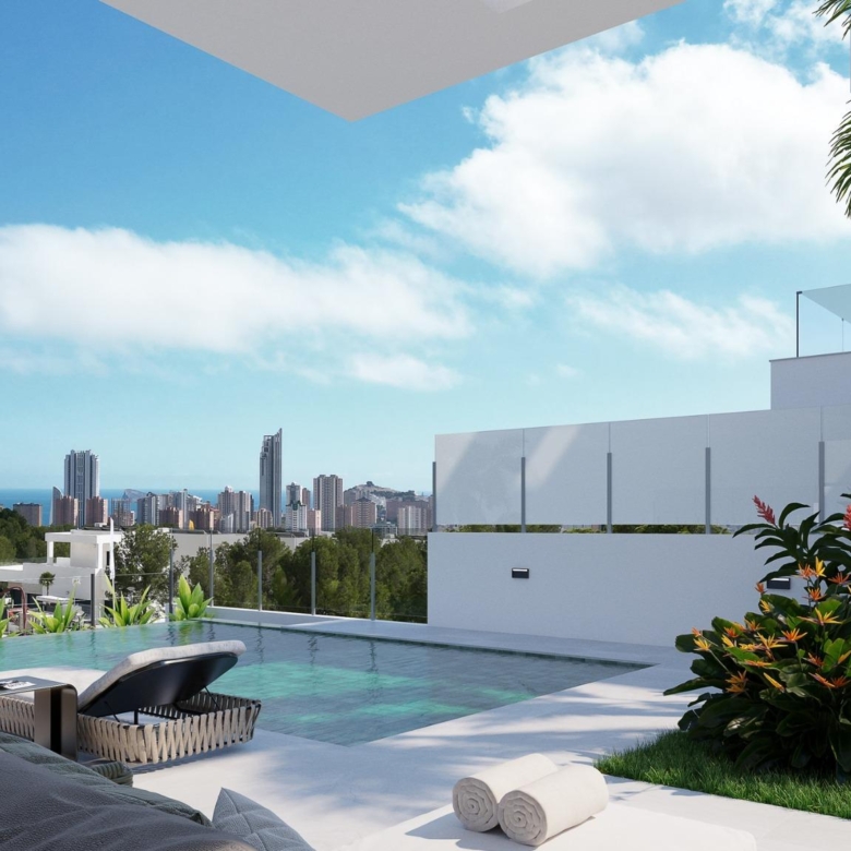 Villas modernes avec 3 chambres et 3 salles de bains, cuisine ouverte avec coin salon, terrasse avec vue magnifique sur Benidorm, jardin privé avec piscine, sous-sol, parking et salle de stockage.