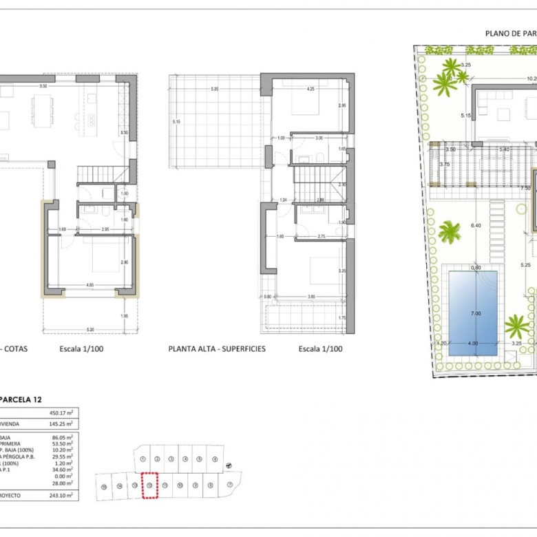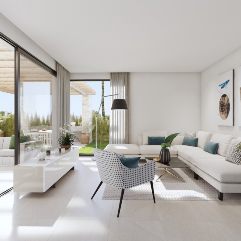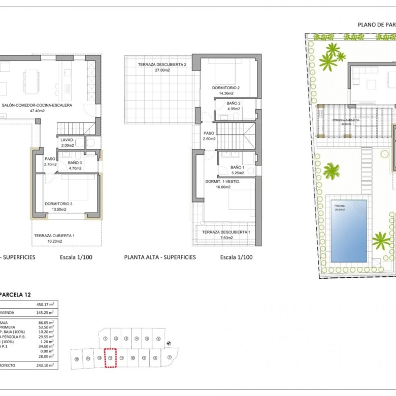Villas de style moderne avec 3 chambres, 3 salles de bains, cuisine ouverte, grand salon avec accès à la terrasse, jardin privé avec piscine et parking.