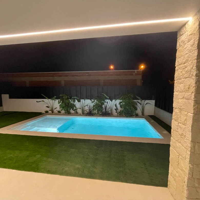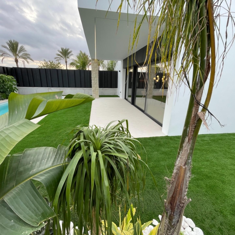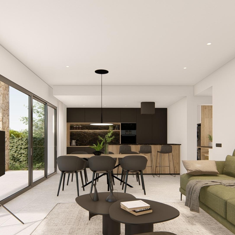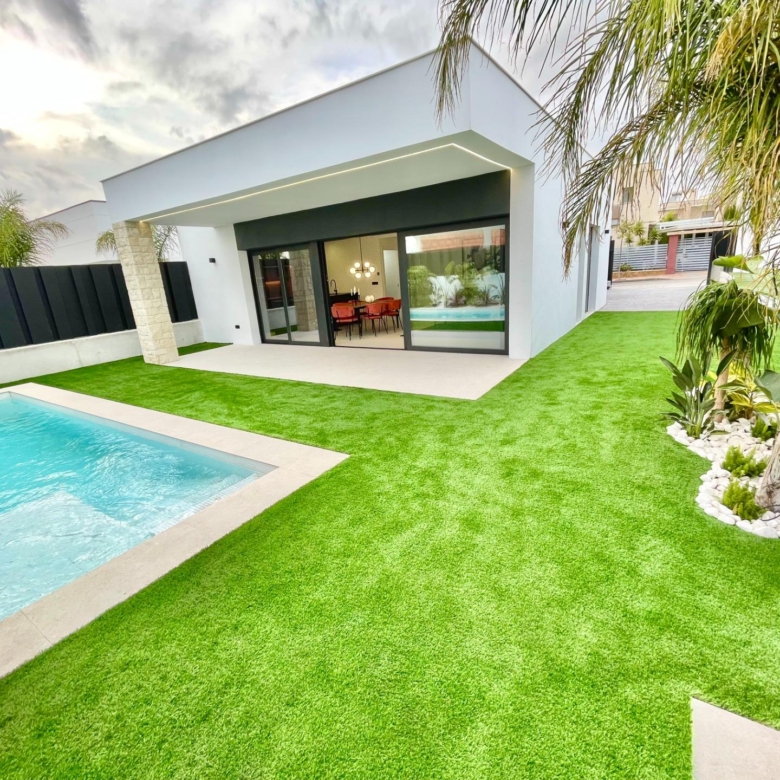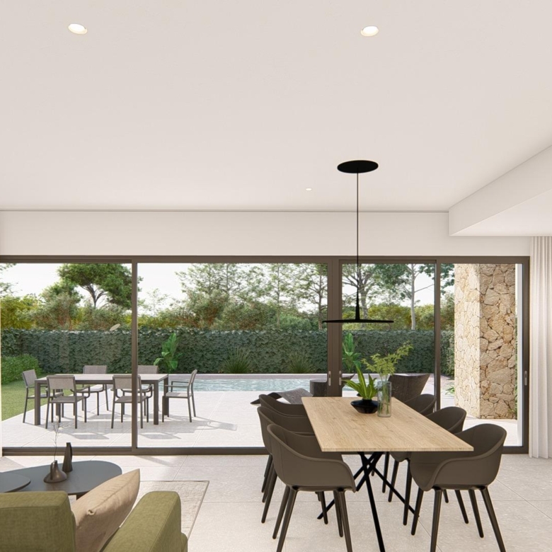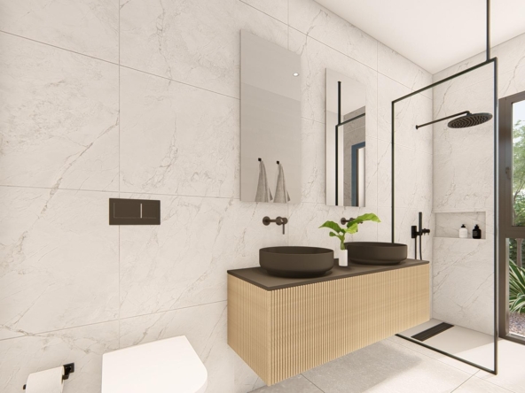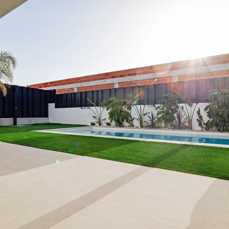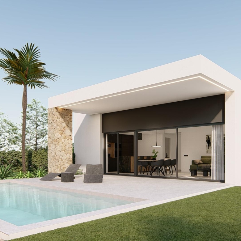 Villa neuve de plain-pied avec 3 chambres, 2 salles de bains, cuisine ouverte sur un salon spacieux, armoires équipées, terrasse, jardin privé avec piscine et place de parking.
