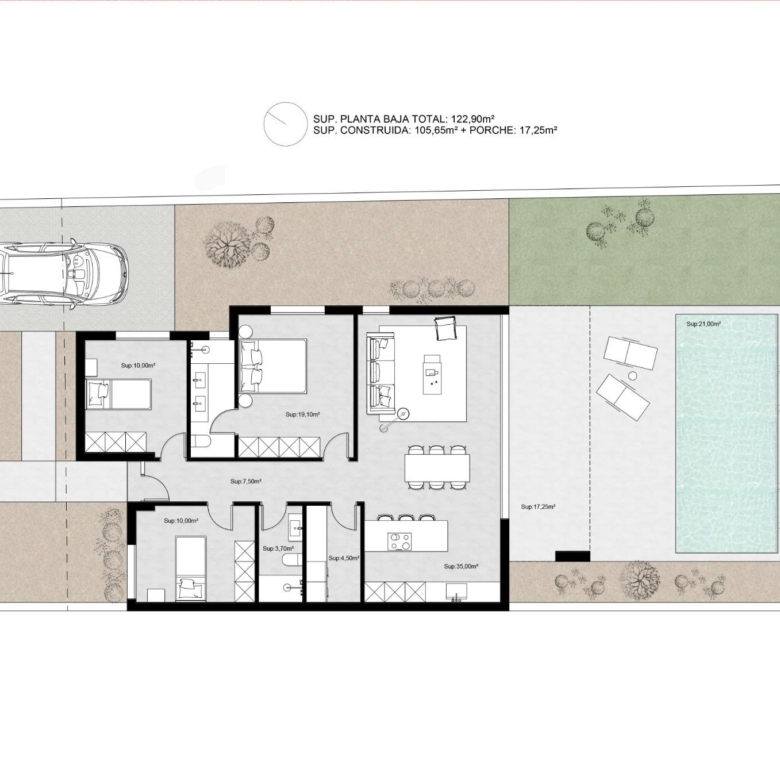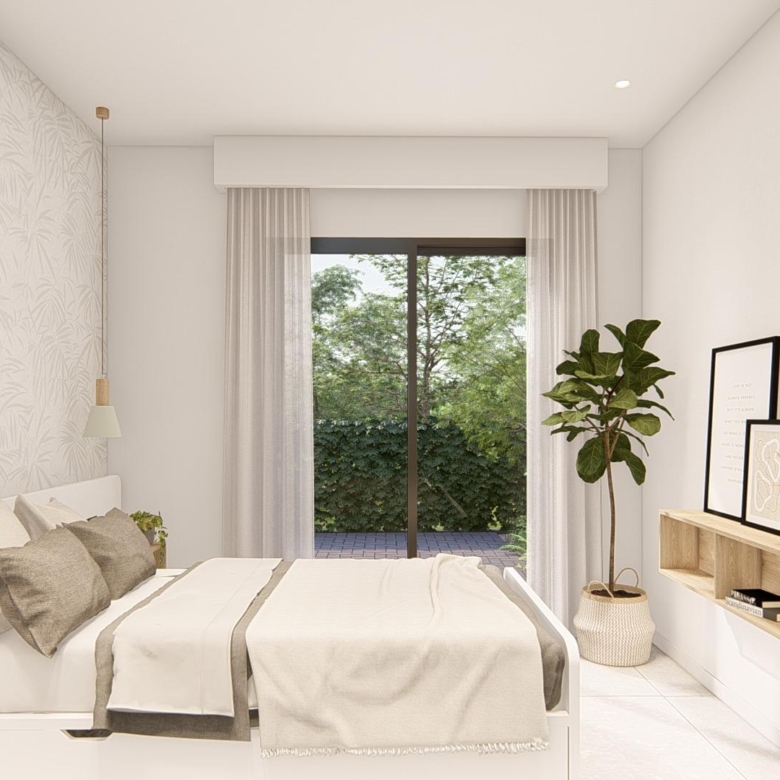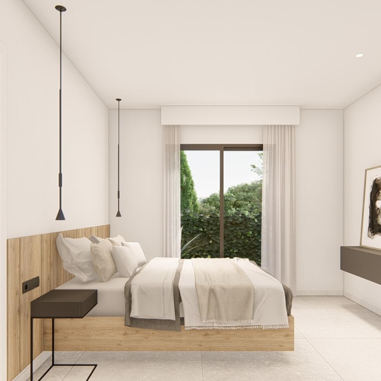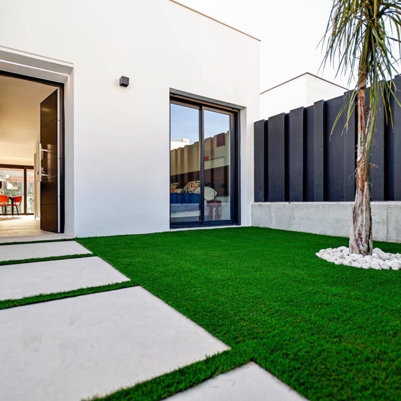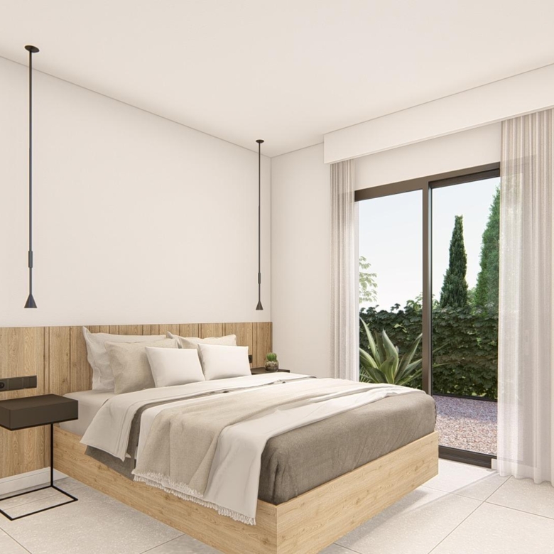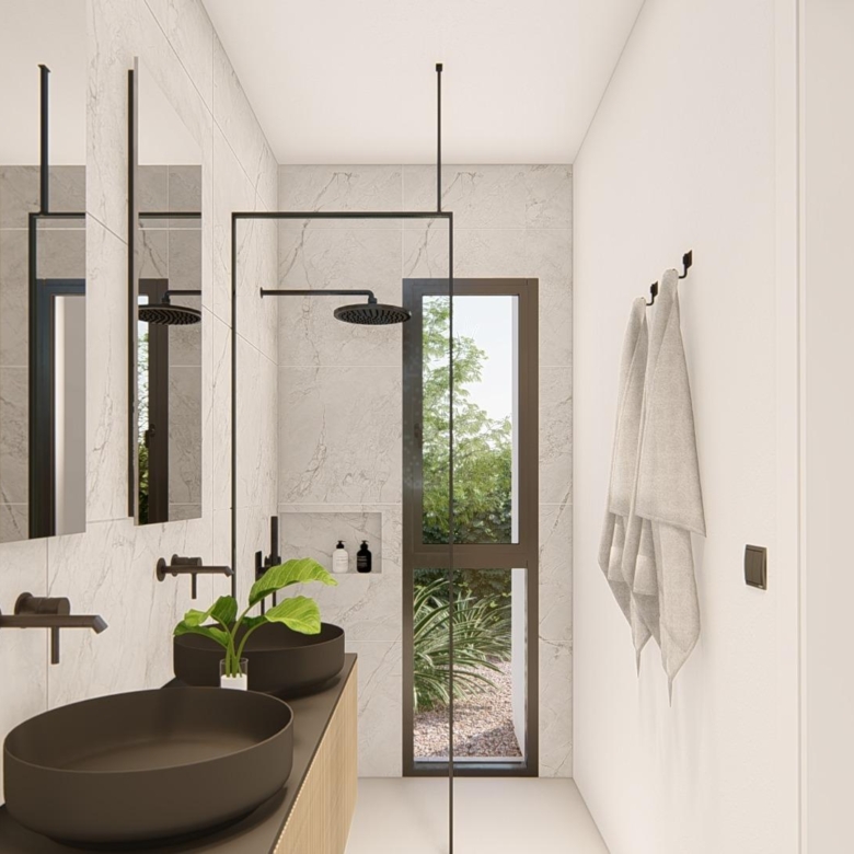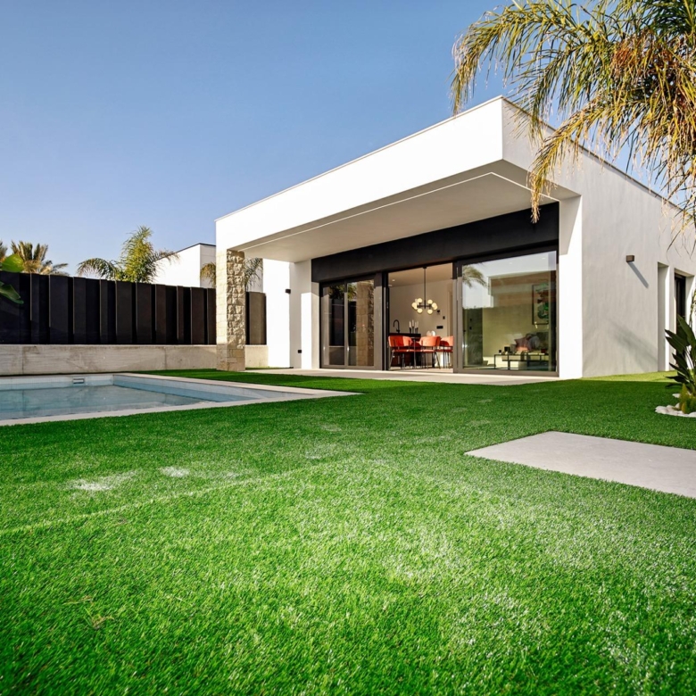 Villa neuve de plain-pied avec 3 chambres, 2 salles de bains, cuisine ouverte sur un salon spacieux, armoires équipées, terrasse, jardin privé avec piscine et place de parking.