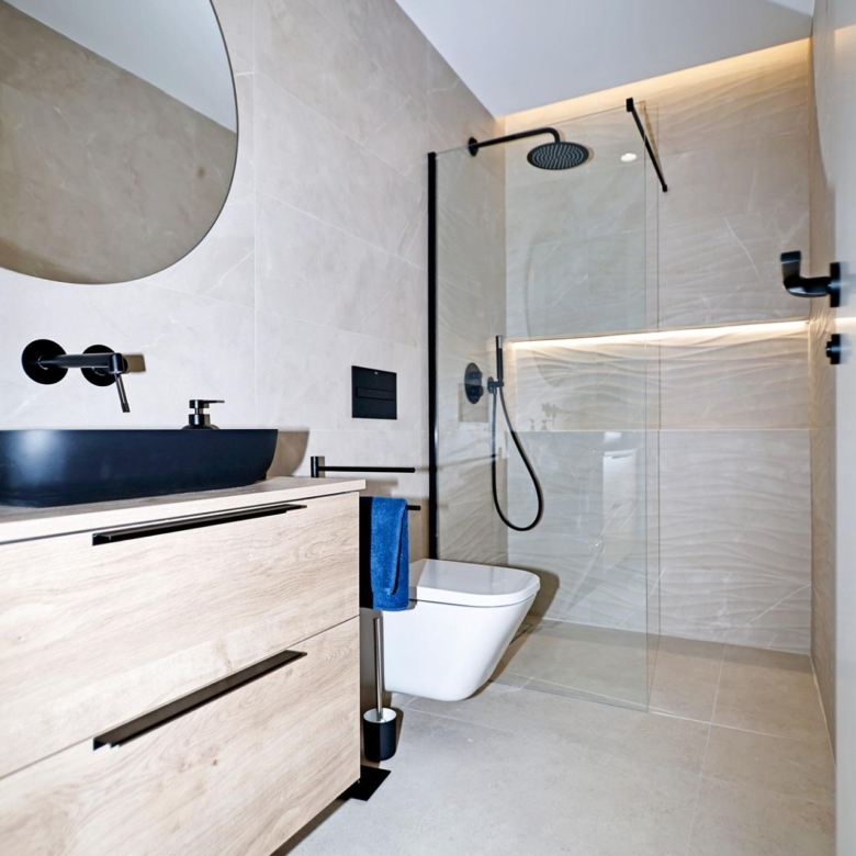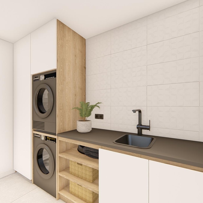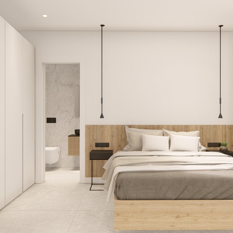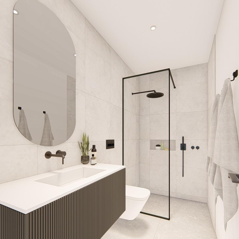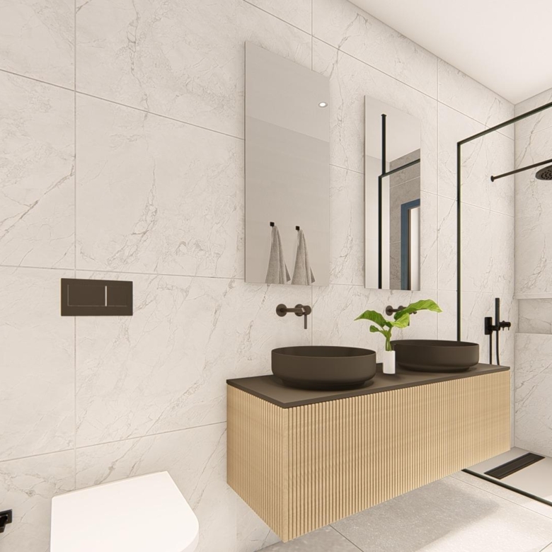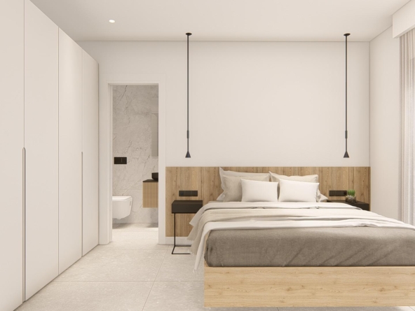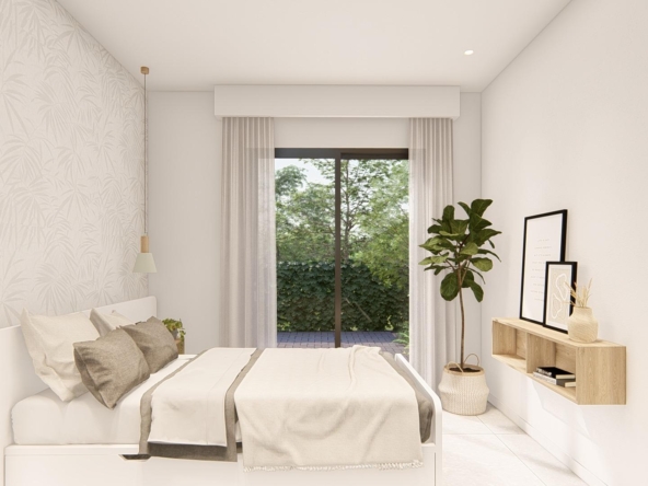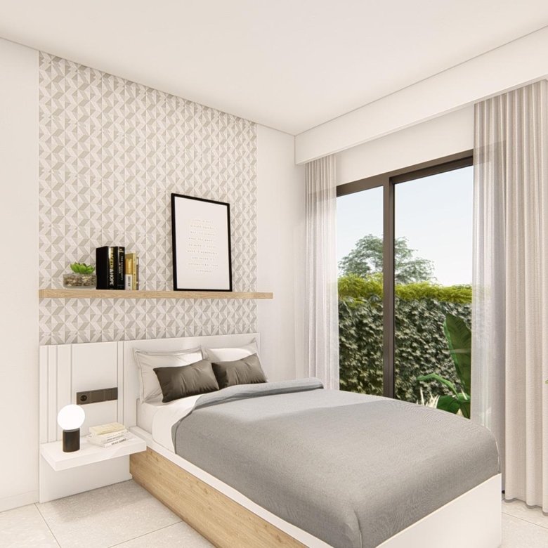 Villa neuve de plain-pied avec 3 chambres, 2 salles de bains, cuisine ouverte sur un salon spacieux, armoires équipées, terrasse, jardin privé avec piscine et place de parking.