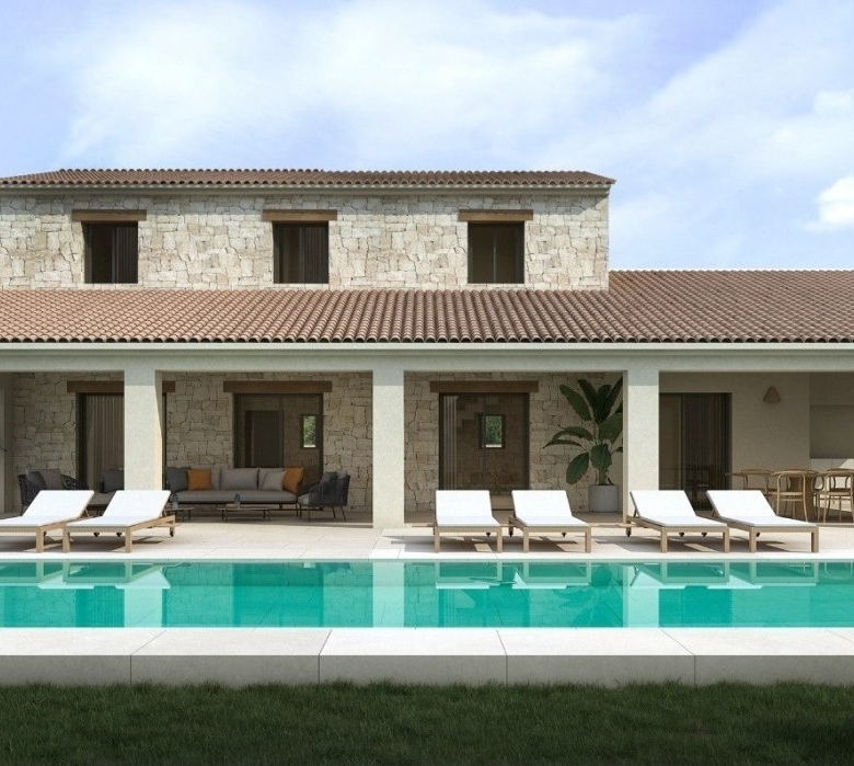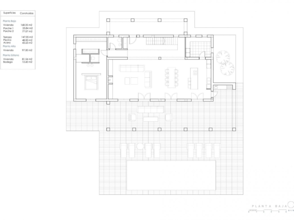 Au rez-de-chaussée, nous trouvons un grand salon-salle à manger et une cuisine ouverte, une chambre principale avec dressing et salle de bains, une terrasse avant avec accès à la piscine.