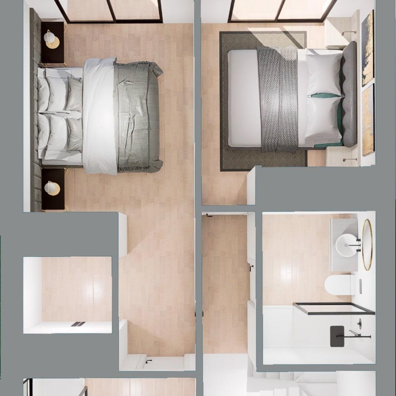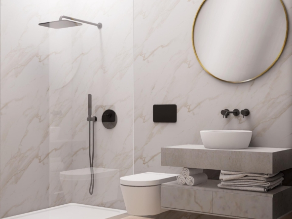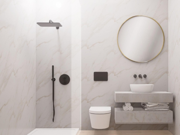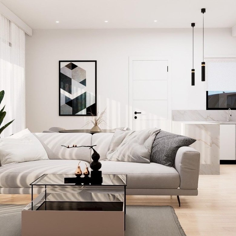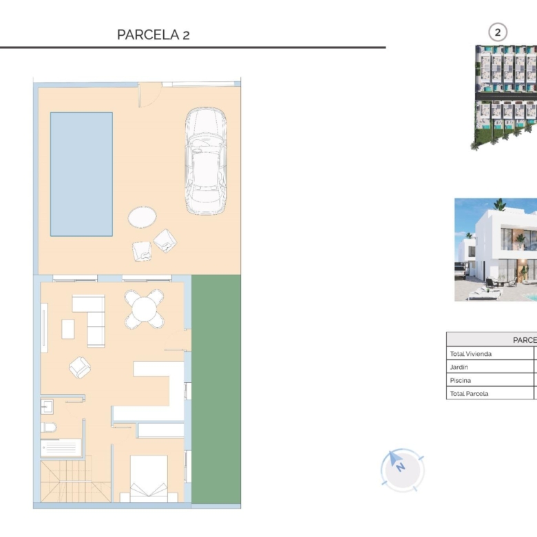 Propriétés modernes construites sur 3 étages, avec 3 chambres à coucher, 2 salles de bains, cuisine ouverte avec coin salon, armoires équipées, climatisation par conduit, sous-sol, solarium, jardin privé avec la piscine et place de parking.