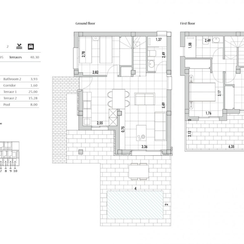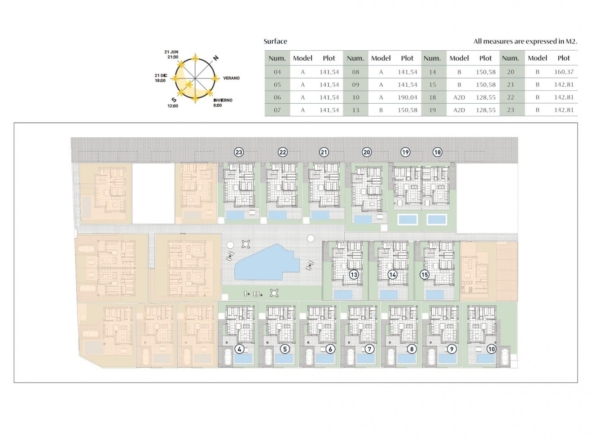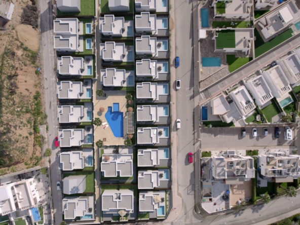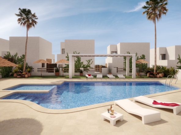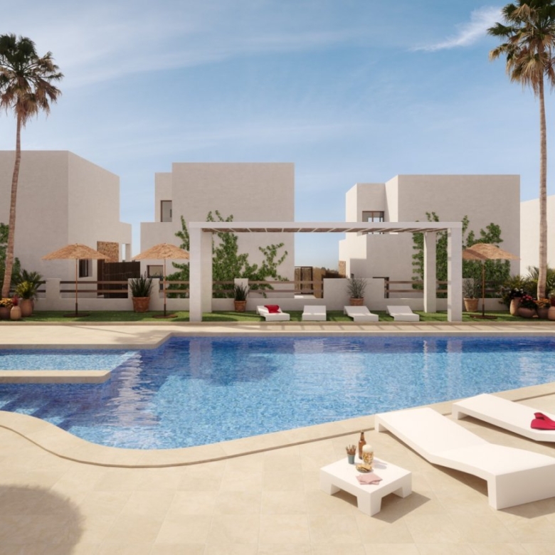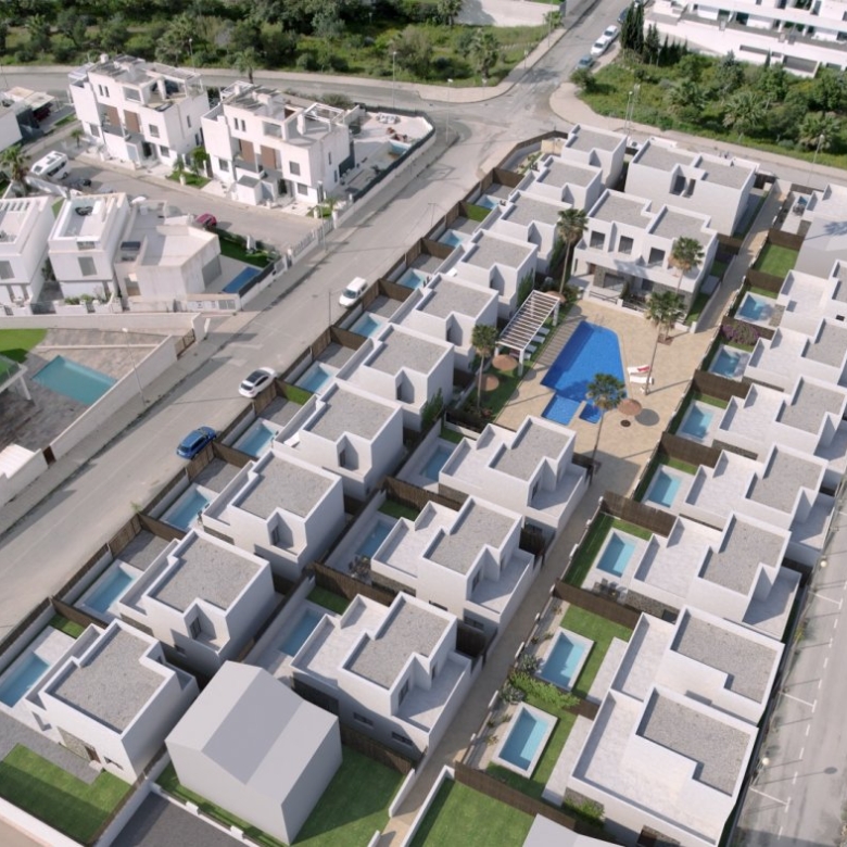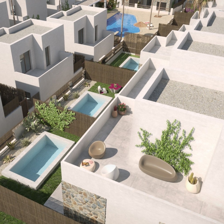 Résidentiel composé de 25 villas sur deux niveaux avec différents modèles indépendants ou jumelés avec 3 chambres et 2 salles de bain, ainsi que des jardins privés et une grande zone commune avec une piscine.