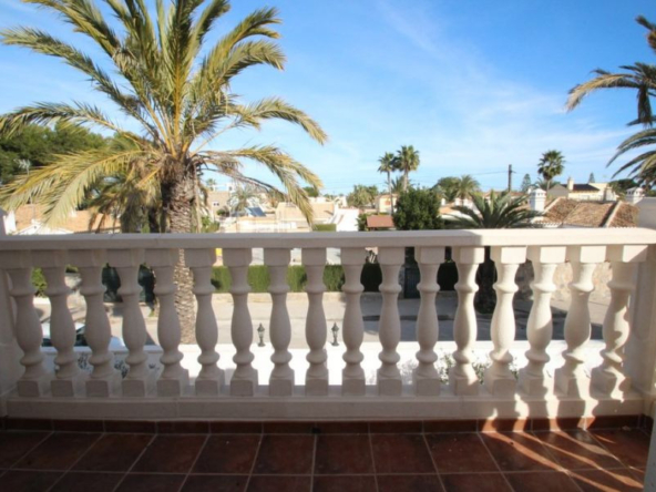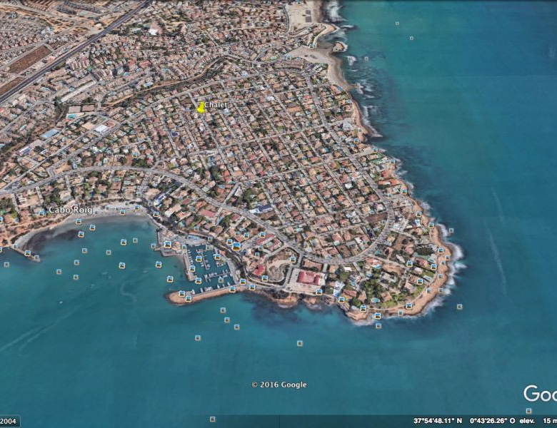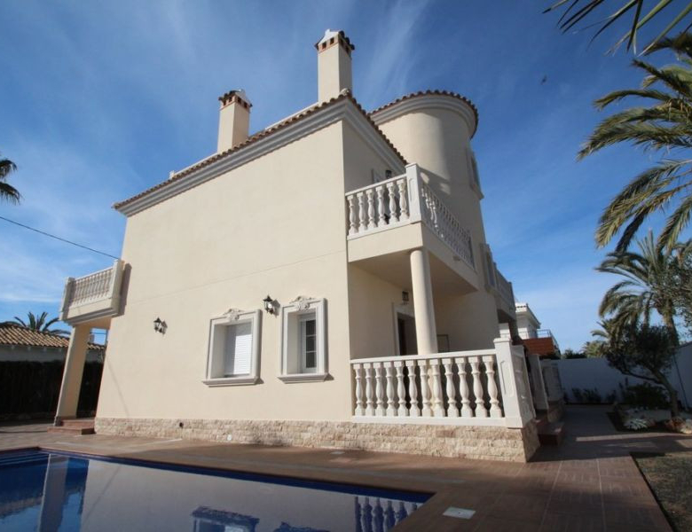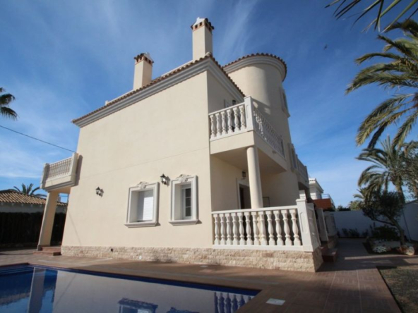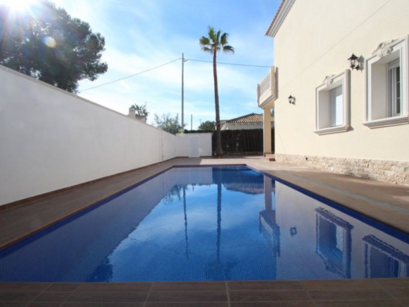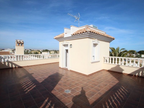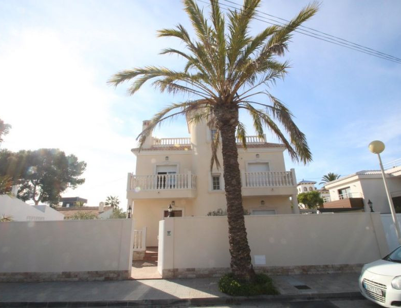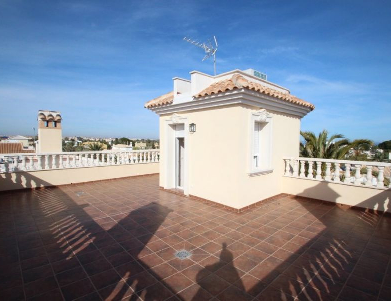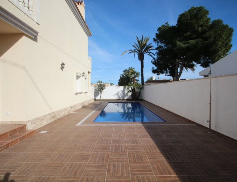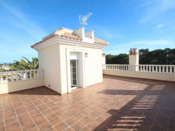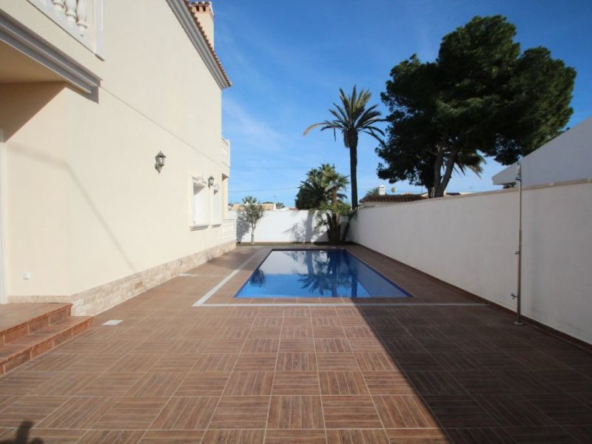 Cabo Roig, Villa de 220 m2 sur terrain de 520 m2 avec piscine. 5 chambres dont 3 en suite, 4 salles de bain avec chauffage au sol, 1 wc, cuisine équipée, ample salon/salle à manger avec cheminée, solarium, terrasses, porche. A 300m de la plage..