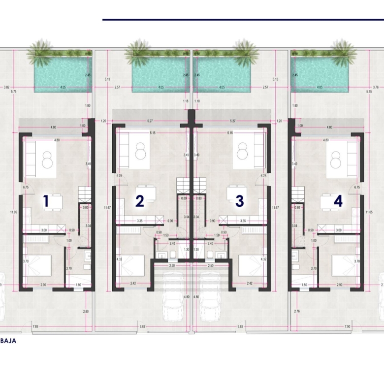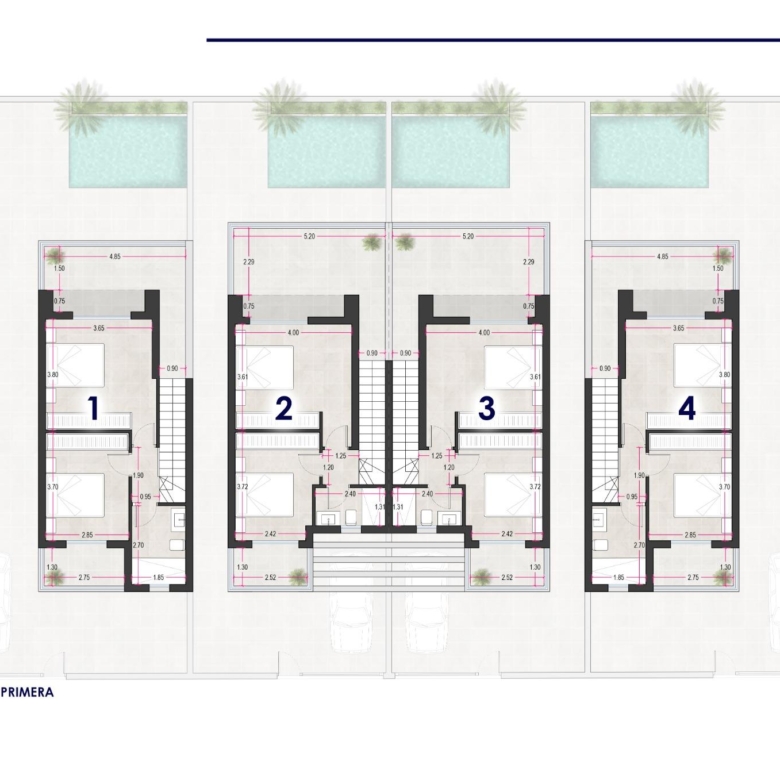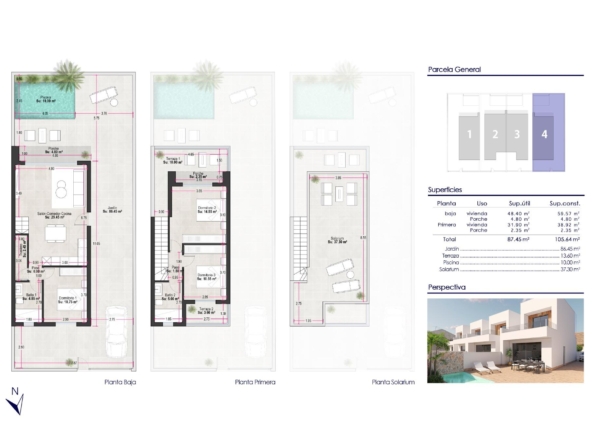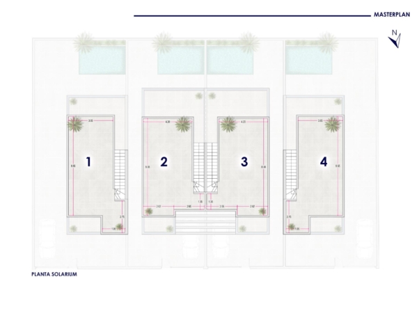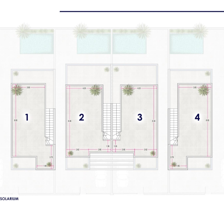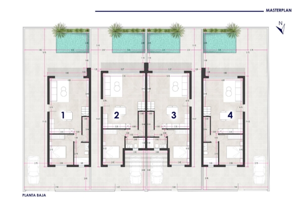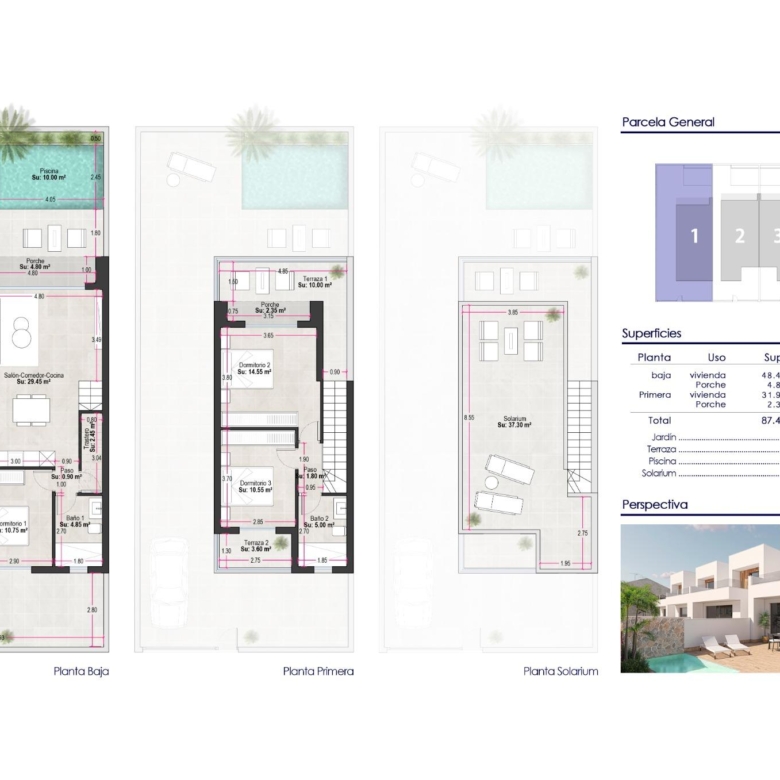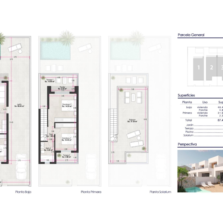 Les villas modernes ont 3 chambres à coucher, 2 salles de bains, cuisine ouverte sur le salon, placards équipés, solarium privé, jardin privé avec piscine et place de parking hors route.