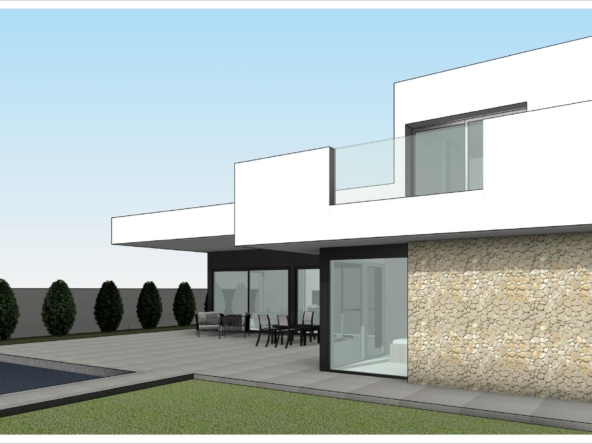 Elle sera équipée d’une piscine de 8x4m avec électrolyseur salin, d’un périmètre de piscine carrelé, d’un espace paysager avec gravier, d’un portail d’accès automatique motorisé à la parcelle (moteur inclus).