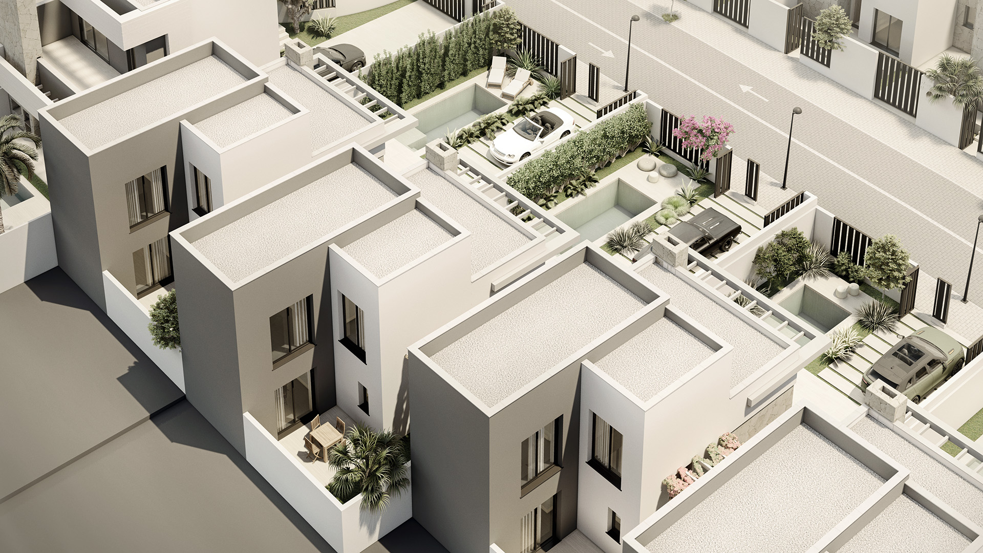 Les maisons présentent un design extérieur qui se distingue par son élégance et sa fonctionnalité. Chaque propriété dispose d’un jardin privé, idéal pour profiter du climat ensoleillé de Pulpí. De plus, les terrasses et le solarium offrent des espaces supplémentaires pour les loisirs en plein air, parfaits pour se détendre ou partager des moments avec la famille et les amis. La présence d’une piscine privée dans chaque maison ajoute une touche de luxe et d’exclusivité, permettant de profiter d’une baignade rafraîchissante dans le confort de son foyer.