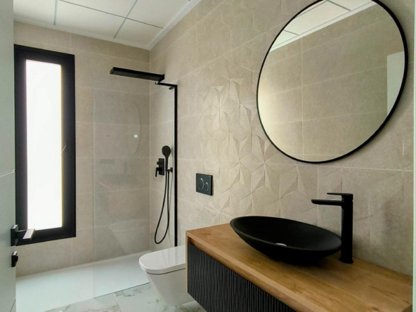 Villa construite sur 2 étages, avec 3 chambres et 2 salles de bains, cuisine ouverte sur le salon, armoires encastrées, terrasse, sous-sol, jardin privé avec piscine et place de parking.