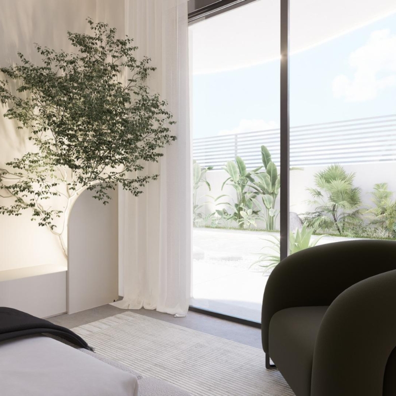 La conception des villas est orientée de manière optimale pour bénéficier d’une température agréable tout au long de l’année, avec une forme en L qui permet à la quasi-totalité de la maison d’avoir une vue et un accès au jardin spacieux et luxuriant.