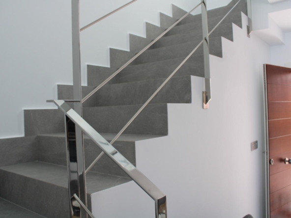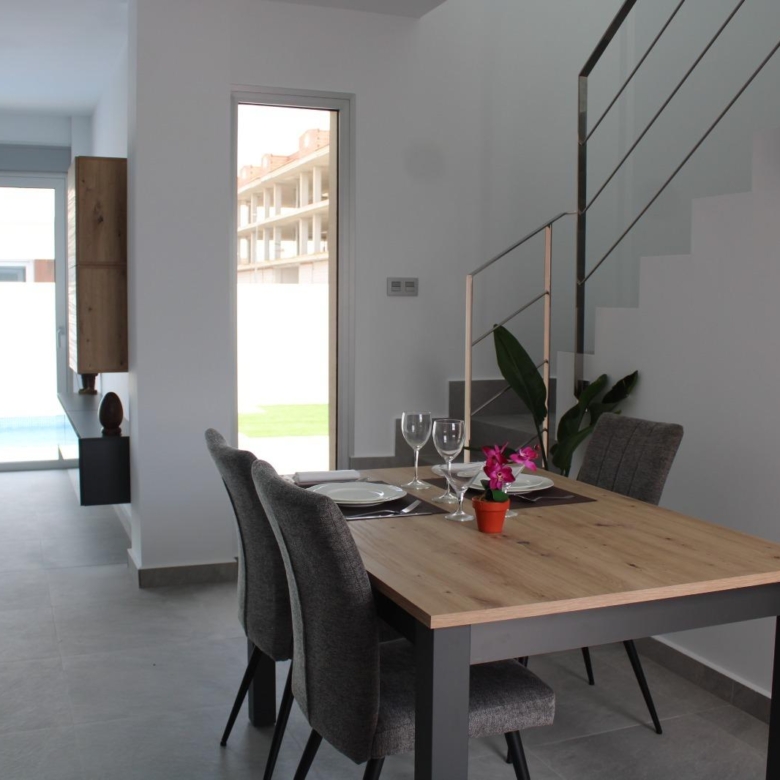 Villas de 130 m2 construites sur des terrains de 180 m2, avec 3 chambres à coucher, 3 salles de bain complètes, 1 toilette, cuisine ouverte sur le salon-salle à manger, placards, terrasses, solarium privé, jardin avec piscine privée et parking.