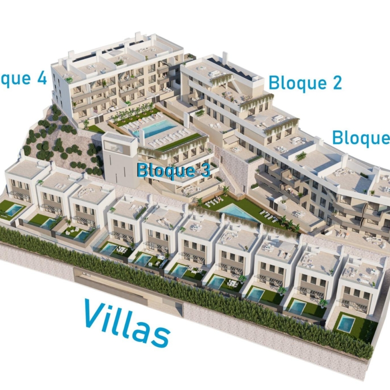 Le complexe consiste en 36 appartements de 3 et 2 chambres à coucher distribués dans 4 blocs modernes, équipés de 2 piscines communes et d’un garage commun avec place de parking et salle de stockage pour chaque propriété ; et 10 villas élégantes de 4 chambres à coucher et 3 salles de bains, chacune avec sa propre piscine privée.
