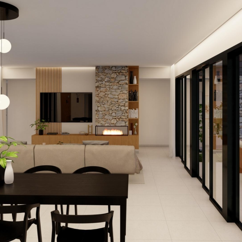 La zone jour a un design ouvert, combinant la cuisine, la salle à manger et le salon dans un grand espace avec de grandes fenêtres qui donnent accès à la zone extérieure avec de grandes terrasses, le jardin et la piscine privée.