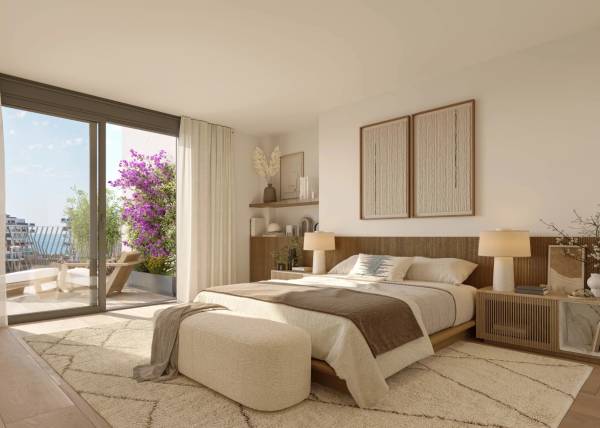 De buitenruimtes van deze woningen zijn ontworpen om optimaal te genieten van het mediterrane klimaat. Elke woning beschikt over privéterrassen, perfect om buiten te ontspannen en van het uitzicht op zee te genieten. Bovendien omvatten sommige typen een solarium, wat extra ruimte biedt voor buitenplezier. De benedenverdiepingen hebben privé tuinen, wat een persoonlijke groene ruimte biedt voor elke bewoner. De nabijheid van de zee, op slechts 200 meter, maakt het mogelijk om op elk moment van de dag van het strand te genieten. De toegang tot een privégarage zorgt voor comfort en veiligheid voor voertuigen, inclusief de optie voor het opladen van elektrische auto's.