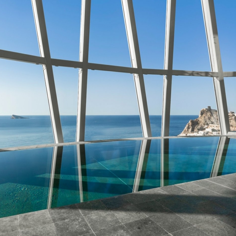 Het gebouw ligt niet aan de rand van de zee zoals de meeste gebouwen in Benidorm, maar is naar achteren geplaatst om een groot plantaardig platform te creëren dat, samen met het grote overloopzwembad, erin slaagt op te gaan in de horizon waardoor een grote oneindige ruimte met de Middellandse Zee ontstaat.