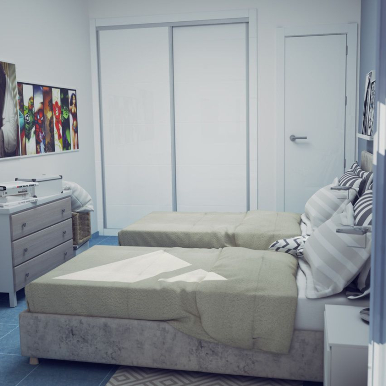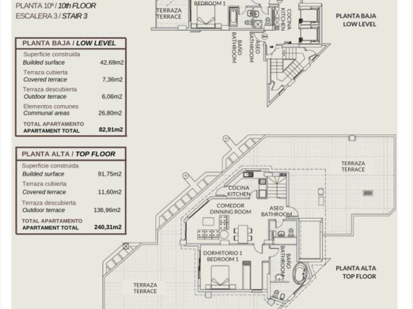 On the first floor, there are 2 bedrooms with covered terraces and two full bathrooms. The second floor includes the master bedroom with its dressing room and a suite bathroom with jacuzzi. apart from another smaller bath, a large kitchen and a spacious dining area with access to a large terrace with incredible view of the Mediterranean Sea and of the Peñón de Ifach, the landmark of Calpe. The common areas offer swimming pools for adults and children, gardens and designated parking lots.