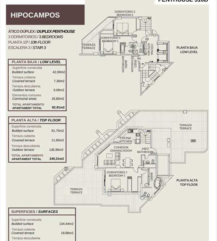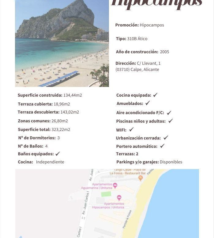 Magnificent penthouse located on the 10th floor of the Hipocampos apartment building situated on the beach front of Levante Beach. It totals 323 m2 divided into 134 m2 of indoor construction, 19m2 of covered terraces and 143 m2 of open terraces with views. The duplex is distributed on 2 levels.