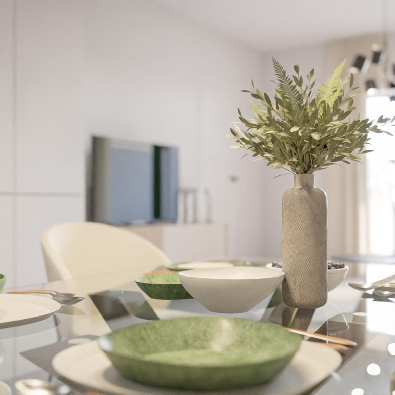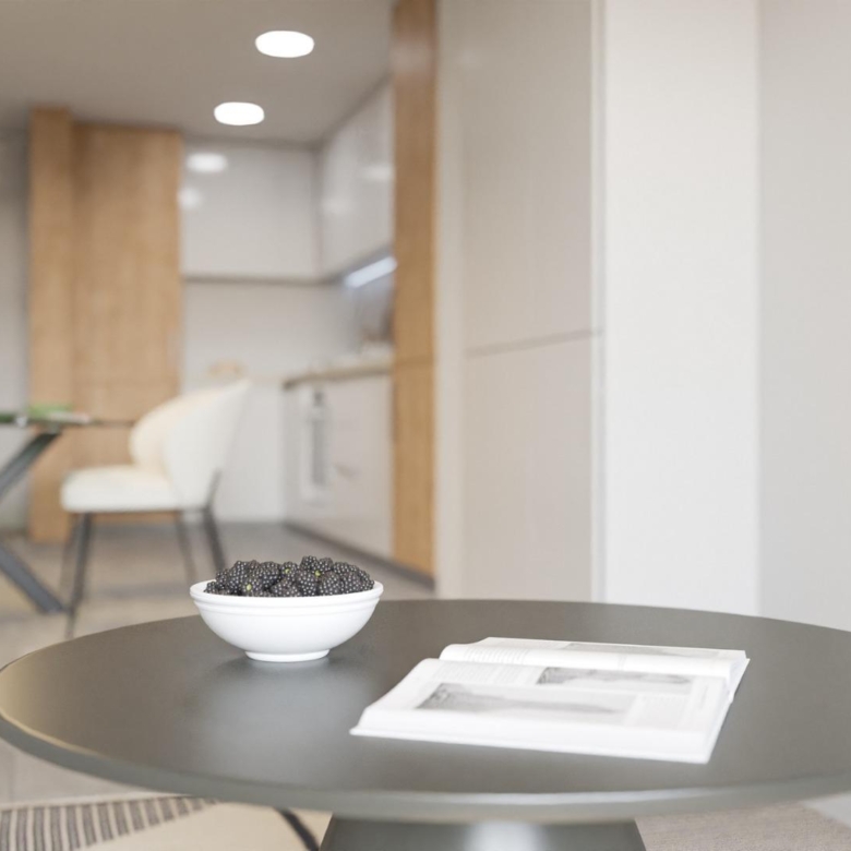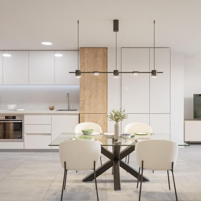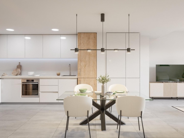 Lichte ruimtes met mediterrane accenten, waar elegantie en warmte elkaar ontmoeten. Met afwerkingen in neutrale tinten en een overwicht van wit bieden deze appartementen een serene en gastvrije sfeer. De open keuken integreert moeiteloos