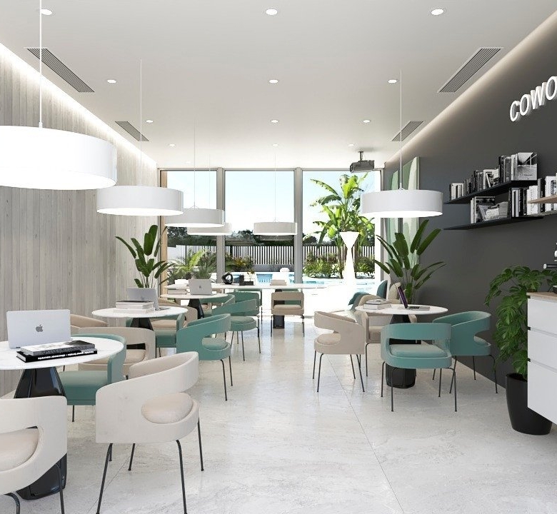 Complex heeft geïnstalleerd een volledig uitgeruste fitnessruimte en volledig ingerichte coworking ruimte met prachtig uitzicht op de tuin.