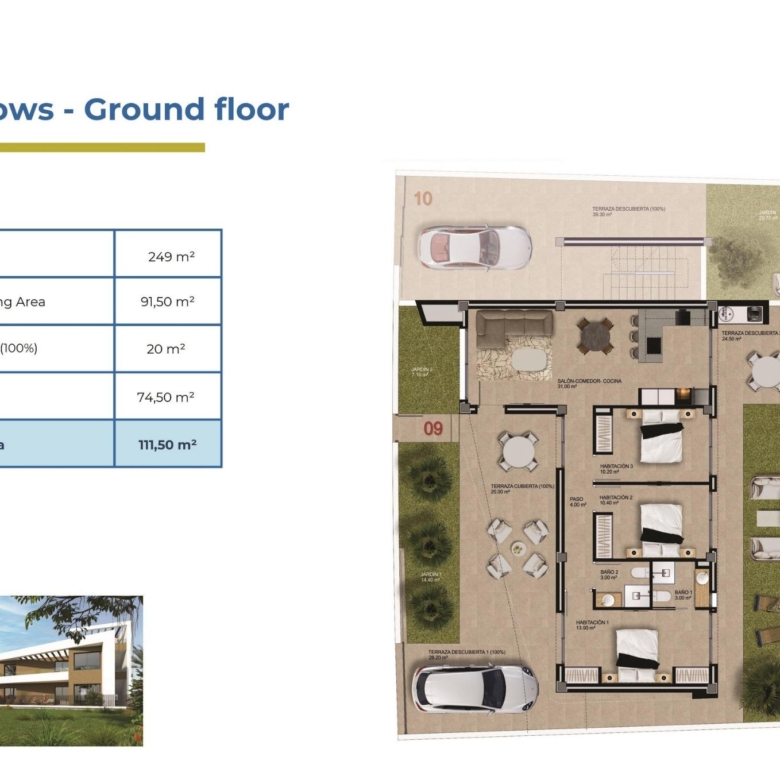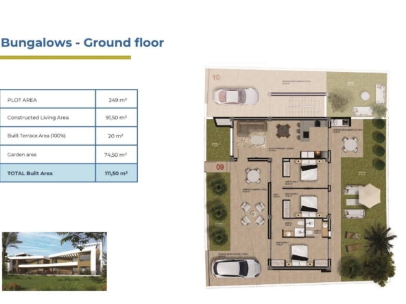 De bungalows op de begane grond hebben uitgestrekte hoektuinen met parkeerplaatsen, waardoor ze extra ruimte en privacy bieden. De bungalows op de bovenverdieping hebben ook een tuin met parkeerplaats en een privé solarium, waar je kunt ontspannen en in volledige afzondering van de zon kunt genieten.