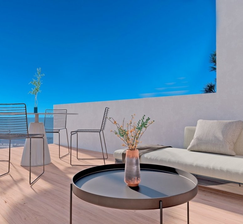 Of bungalows van 178m2 op de eerste verdieping met een solarium van 85m2 met panoramisch uitzicht op de Laguna Rosa en de Middellandse Zee.