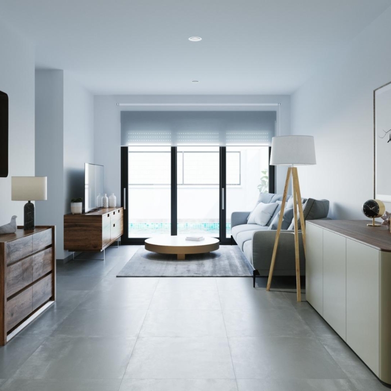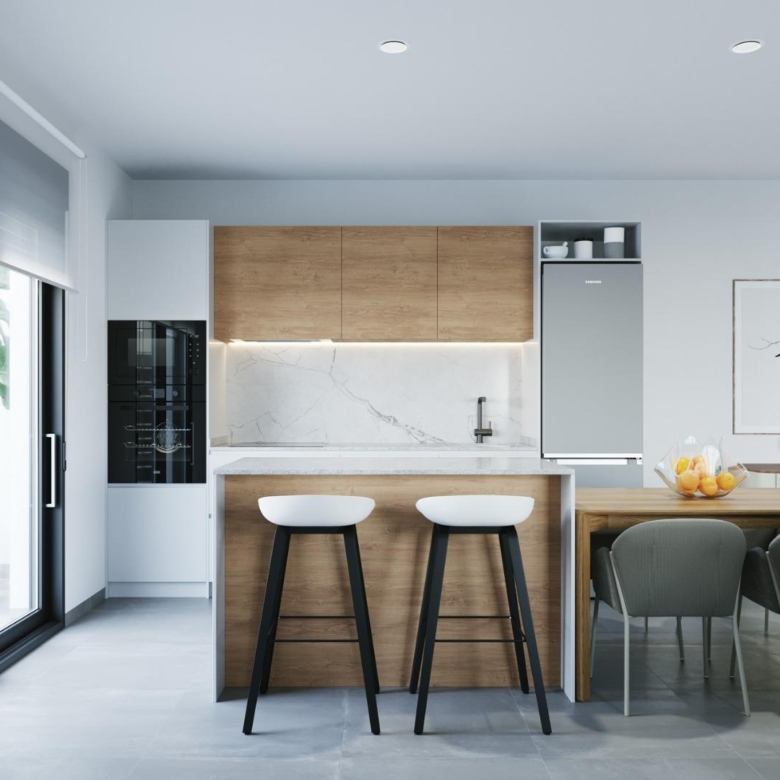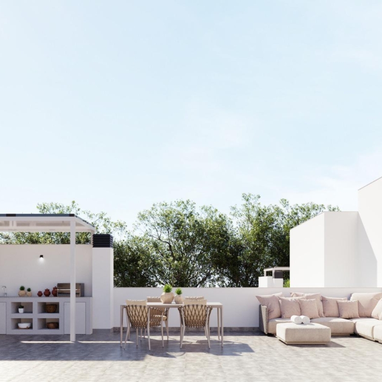 Moderne woningen met 2 slaapkamers en 2 badkamers, open keuken met woonkamer, inbouwkasten, terras, privésolarium, tuin met zwembad en parkeerplaats.