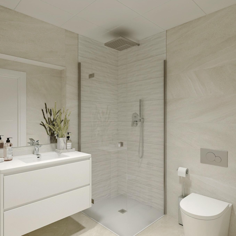 Deze appartementen zijn gebouwd met het oog op energie-efficiëntie en zijn voorzien van hoogwaardige aluminium buitenschrijnwerk met thermische onderbrekingstechnologie en automatische gemotoriseerde rolluiken. Elke eenheid is vooraf geïnstalleerd voor klimaatbeheersing door middel van airconditioning en verwarming, waardoor het hele jaar door comfort wordt gegarandeerd. Voor extra veiligheid zijn alle toegangsdeuren gepantserd met veilige sloten en zijn de binnendeuren afgewerkt met witte lak. Bovendien is elke unit uitgerust met een energiebesparend aerothermisch systeem voor warm water, wat het energieverbruik aanzienlijk vermindert.